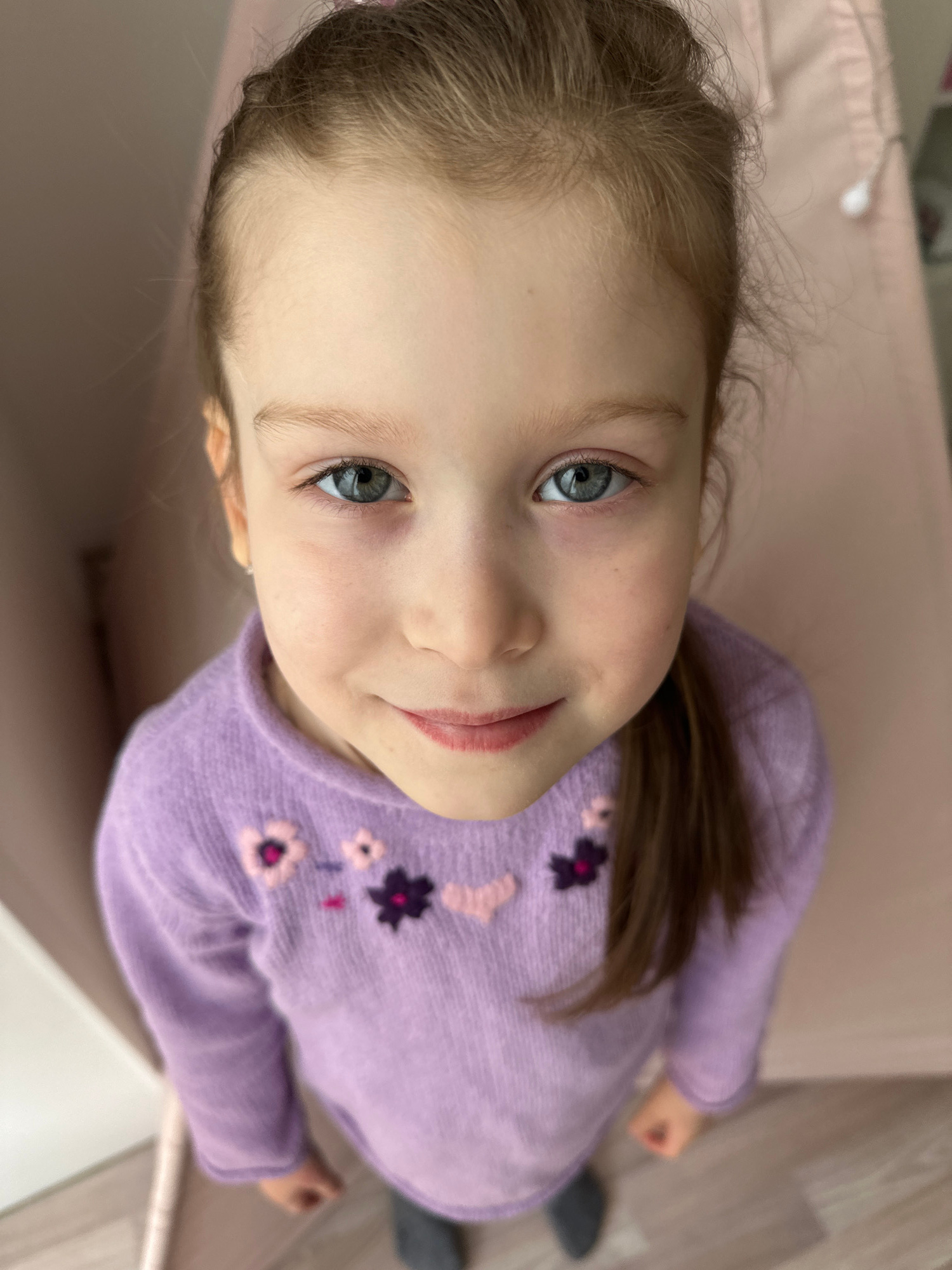 A young child with fair skin, light blonde hair, and light blue eyes wearing a light purple long-sleeve sweater with pink and dark purple floral designs is looking up at the camera. The background sho…read more
