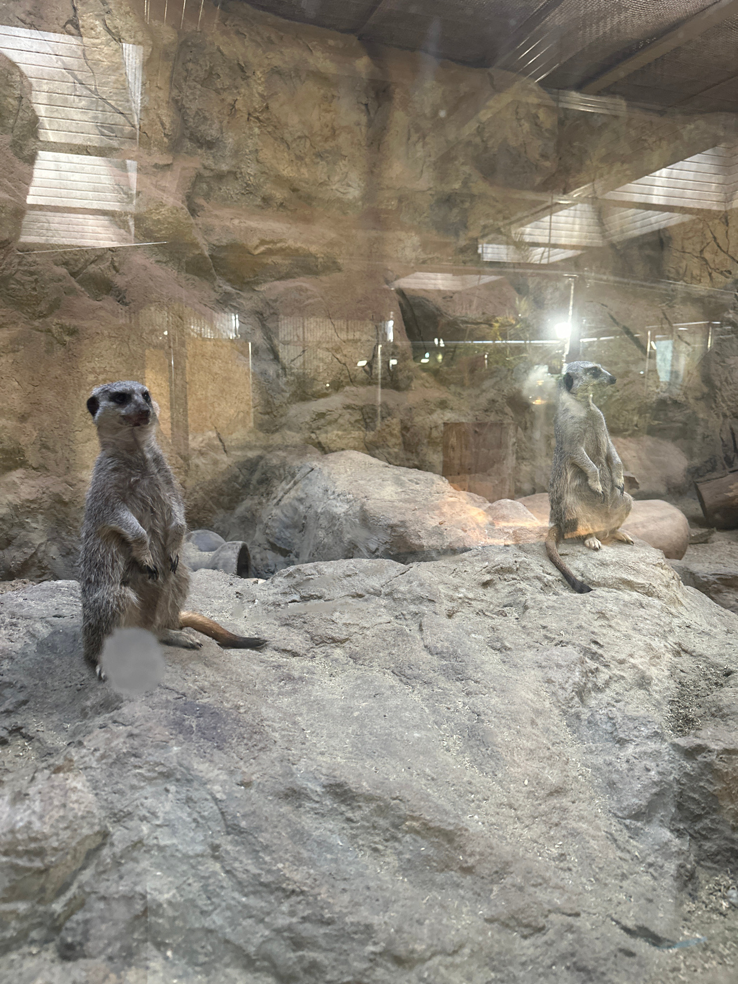 This media file depicts an indoor zoo exhibit featuring meerkats. The primary subject is a meerkat standing upright on a textured, grey-brown artificial rock formation in the foreground, facing toward…read more