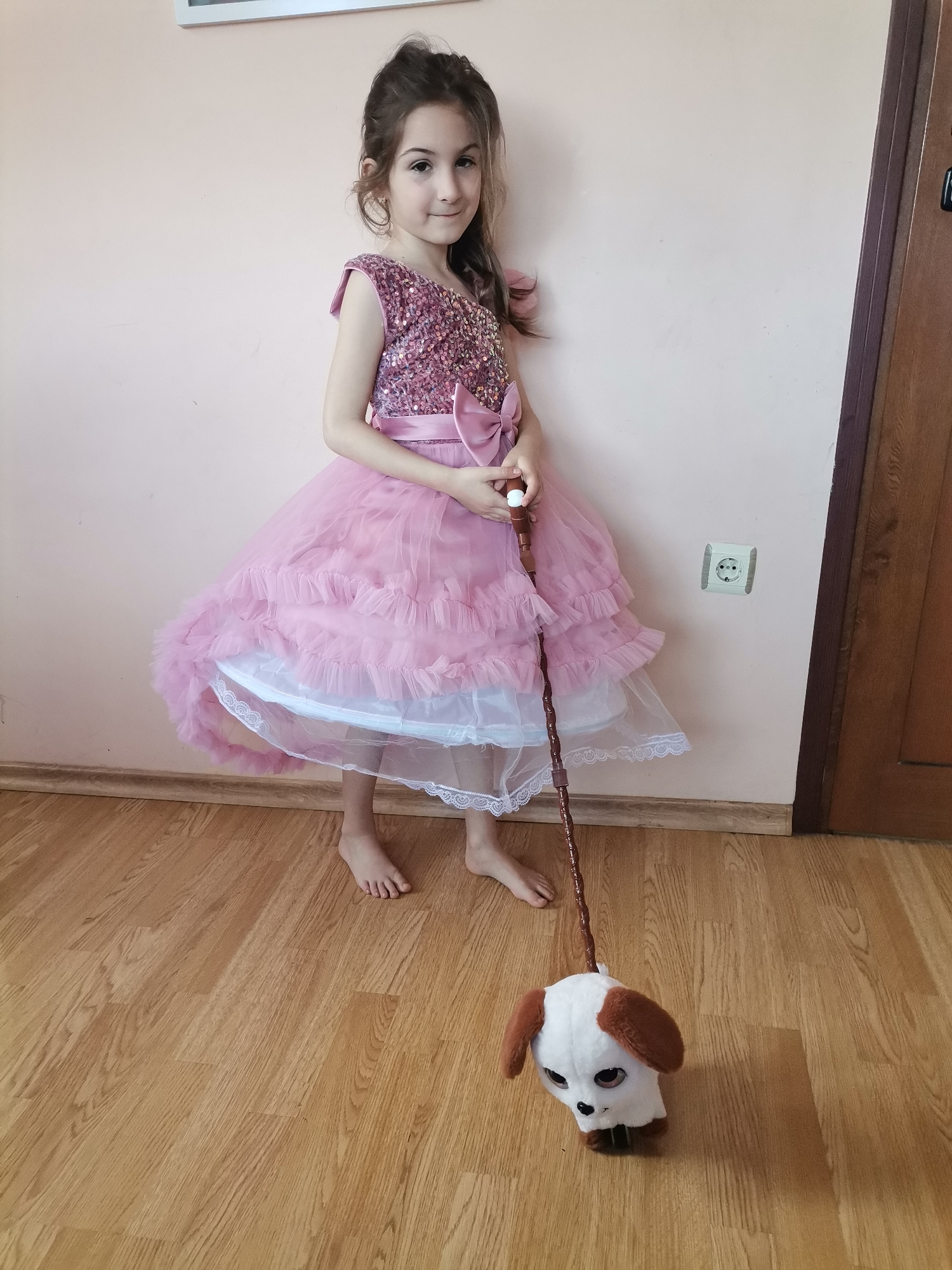 A young girl stands in a room with wooden floors and light pink walls, wearing a pink sequined dress with a ruffled skirt and a matching pink sash. She holds a brown walking stick with a white knob at…read more