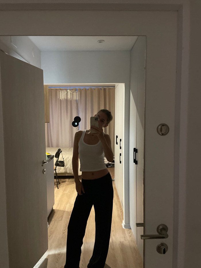 A woman in a white tank top and black leggings takes a selfie in a mirror. A desk or countertop reflects in the lower portion of the mirror. Behind her, a curtained window is visible. The room feature…read more
