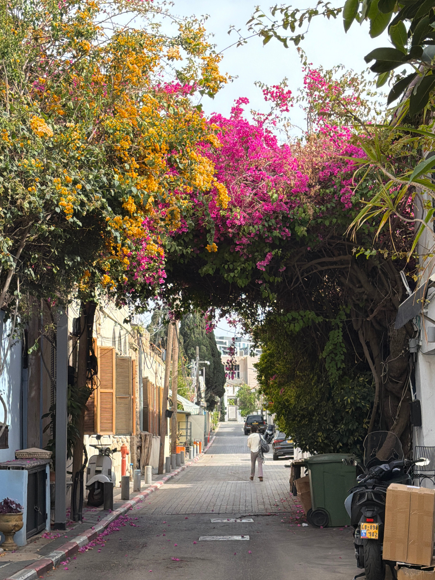 The image depicts a street scene in Tel Aviv, Israel. The view is from a slightly elevated position, looking down a narrow street lined with buildings on both sides. The street is paved with brick or…read more