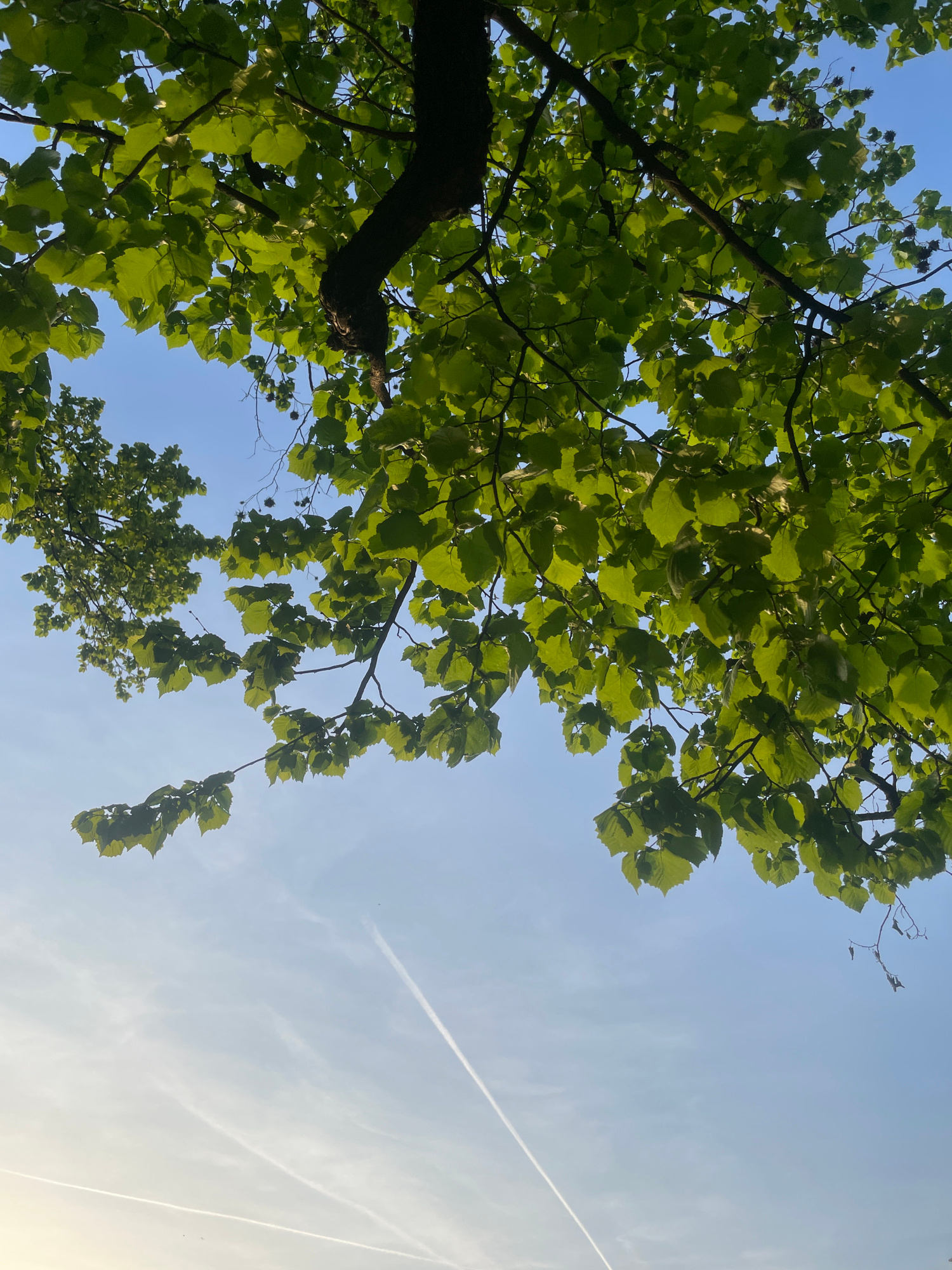 The image presents an upward view into the canopy of a deciduous tree against a clear blue sky. Lush, vibrant green leaves dominate the foreground, illuminated by sunlight filtering through them, crea…read more