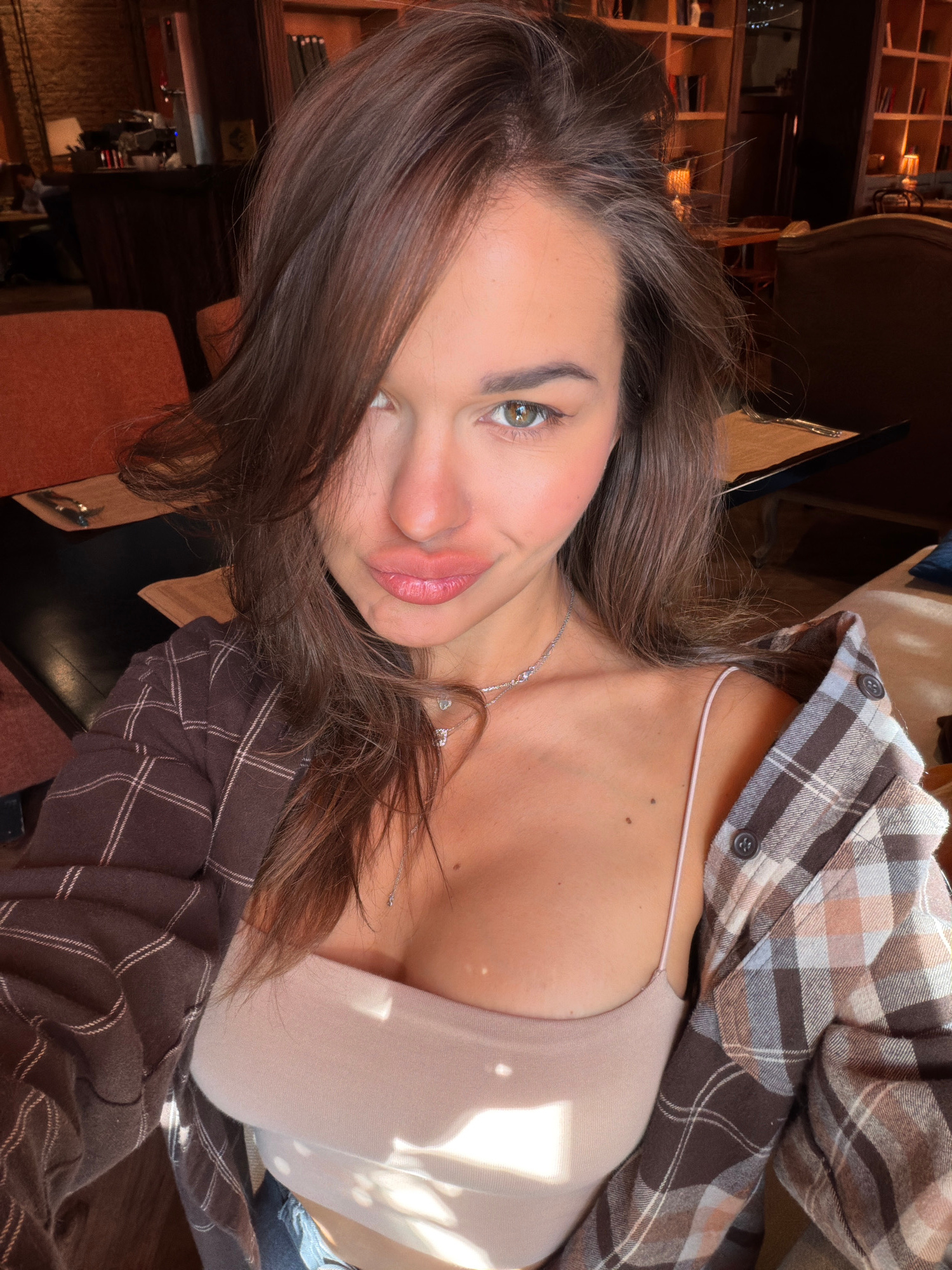 A woman with brown hair, wearing a beige top and a brown and white plaid shirt, is posing for a selfie. The background features wooden shelves and a chair, suggesting an indoor setting, possibly a caf…read more