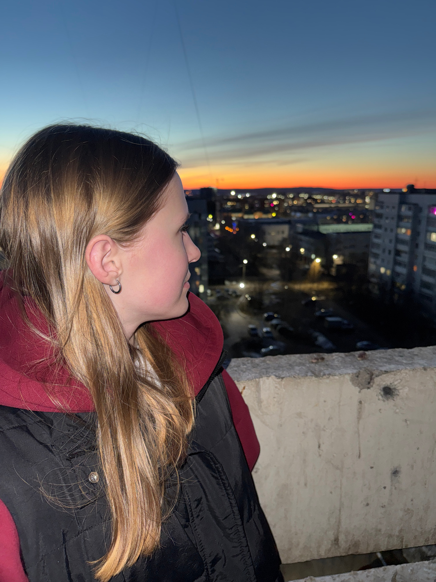 A young woman is on a balcony at dusk or night. She is facing away from the camera looking at the buildings of Chaikovsky, Russia below. She is wearing a dark jacket and a maroon hoodie. The balcony i…read more