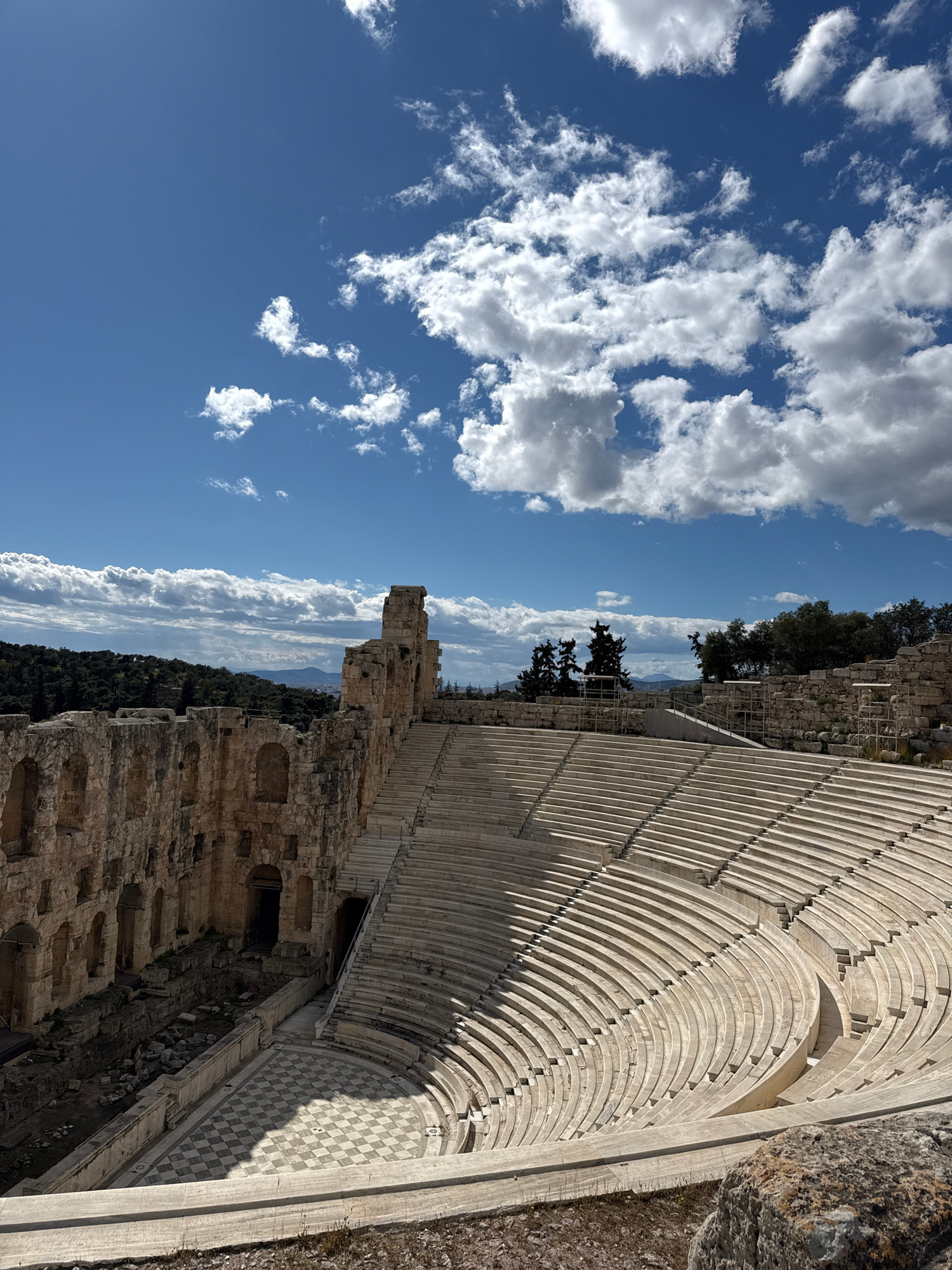 The image shows the Odeon of Herodes Atticus, an ancient Roman theater located on the southwest slope of the Acropolis in Athens, Greece. The theater is constructed of stone and features tiered seatin…read more