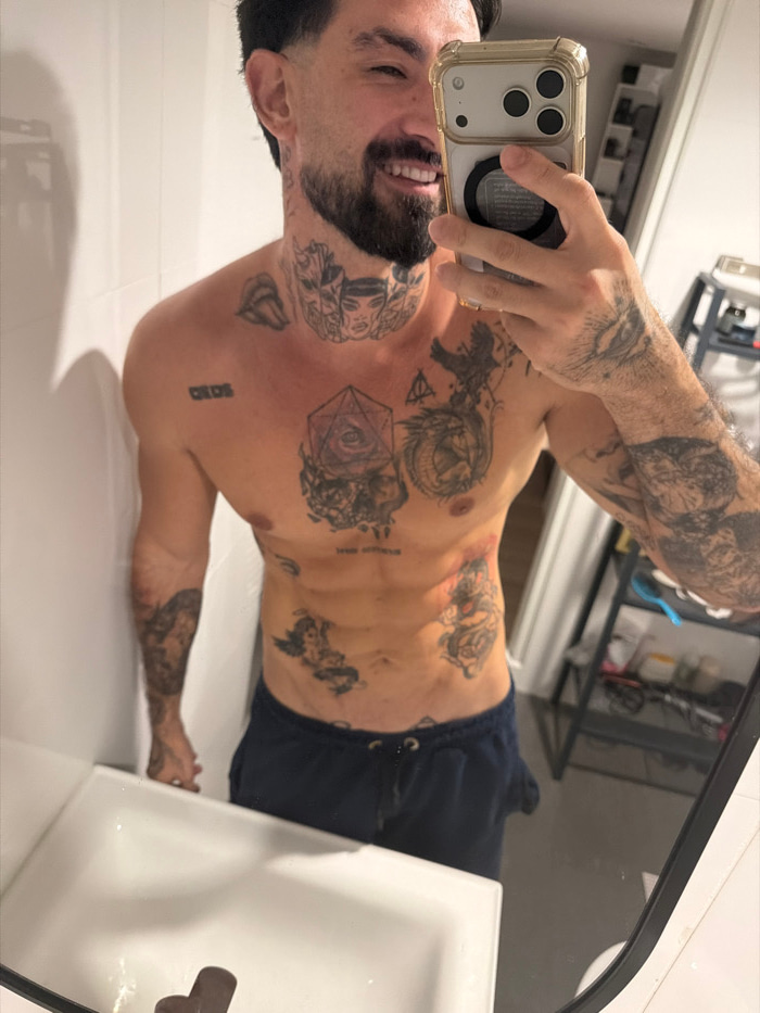A shirtless male individual with dark hair and a trimmed beard is depicted taking a mirror selfie in what appears to be a bathroom in Bangkok, Thailand. The subject is smiling directly towards the cam…read more