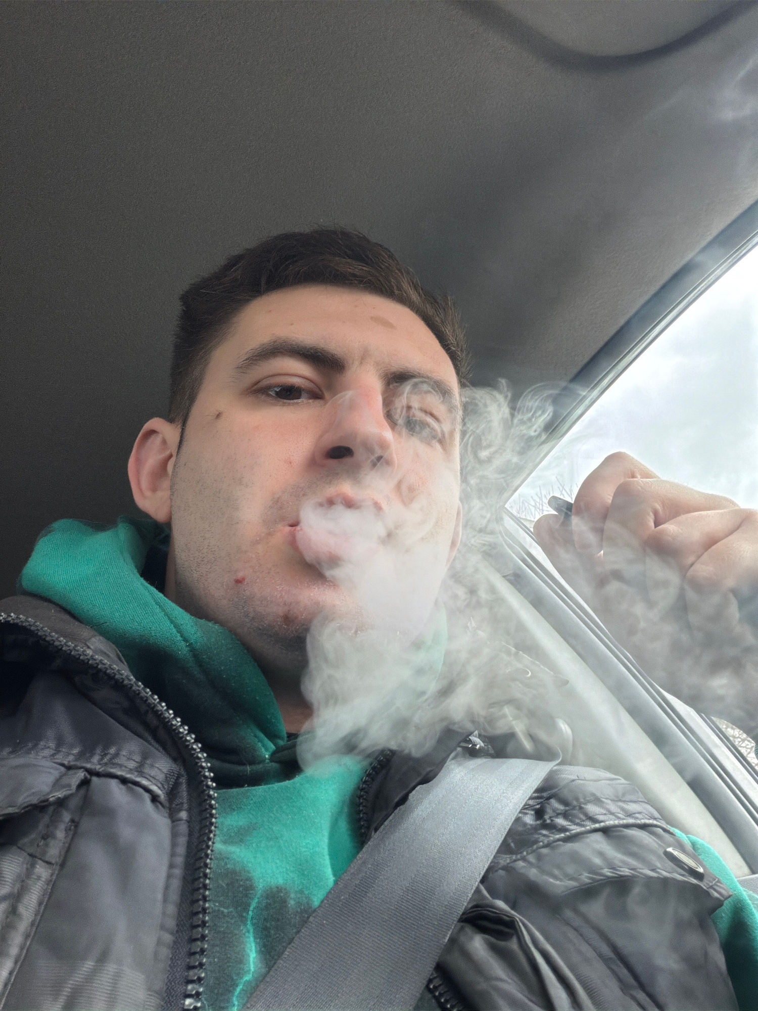 A man is in the driver's seat of a car, wearing a green hoodie and a black jacket with the seatbelt fastened. He is exhaling smoke, possibly from a cigarette or vape pen held by another person outside…read more