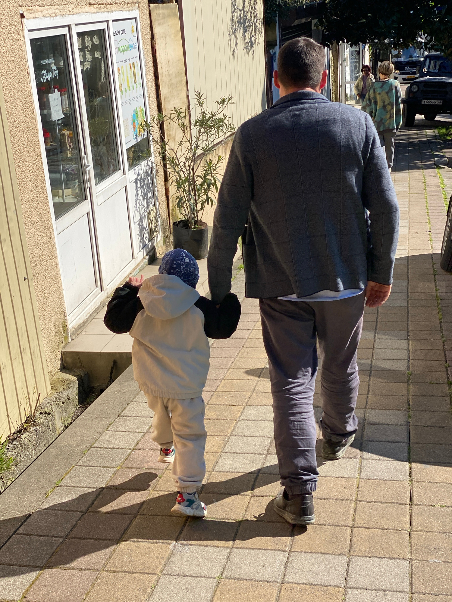 The image depicts a man and a child walking along a paved sidewalk, likely in the city of Sochi, Russia. The man is wearing a dark gray checkered blazer, gray pants, and dark-colored shoes. The child,…read more
