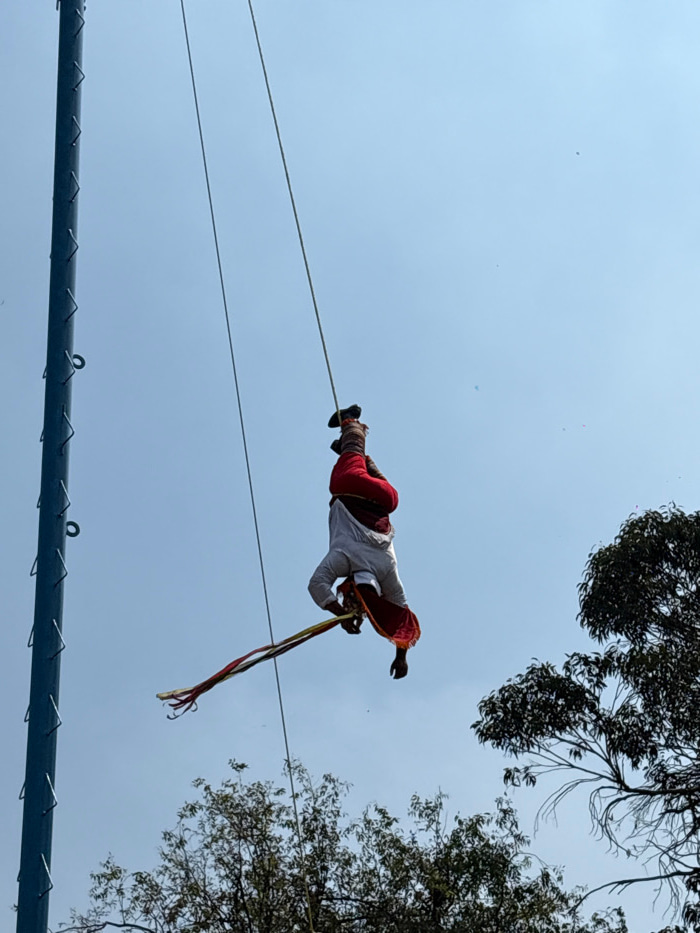 An outdoor, daytime scene under a clear blue sky depicts a single individual suspended upside down by their ankles. The person, identifiable as a "Volador" performer, wears traditional attire includin…read more