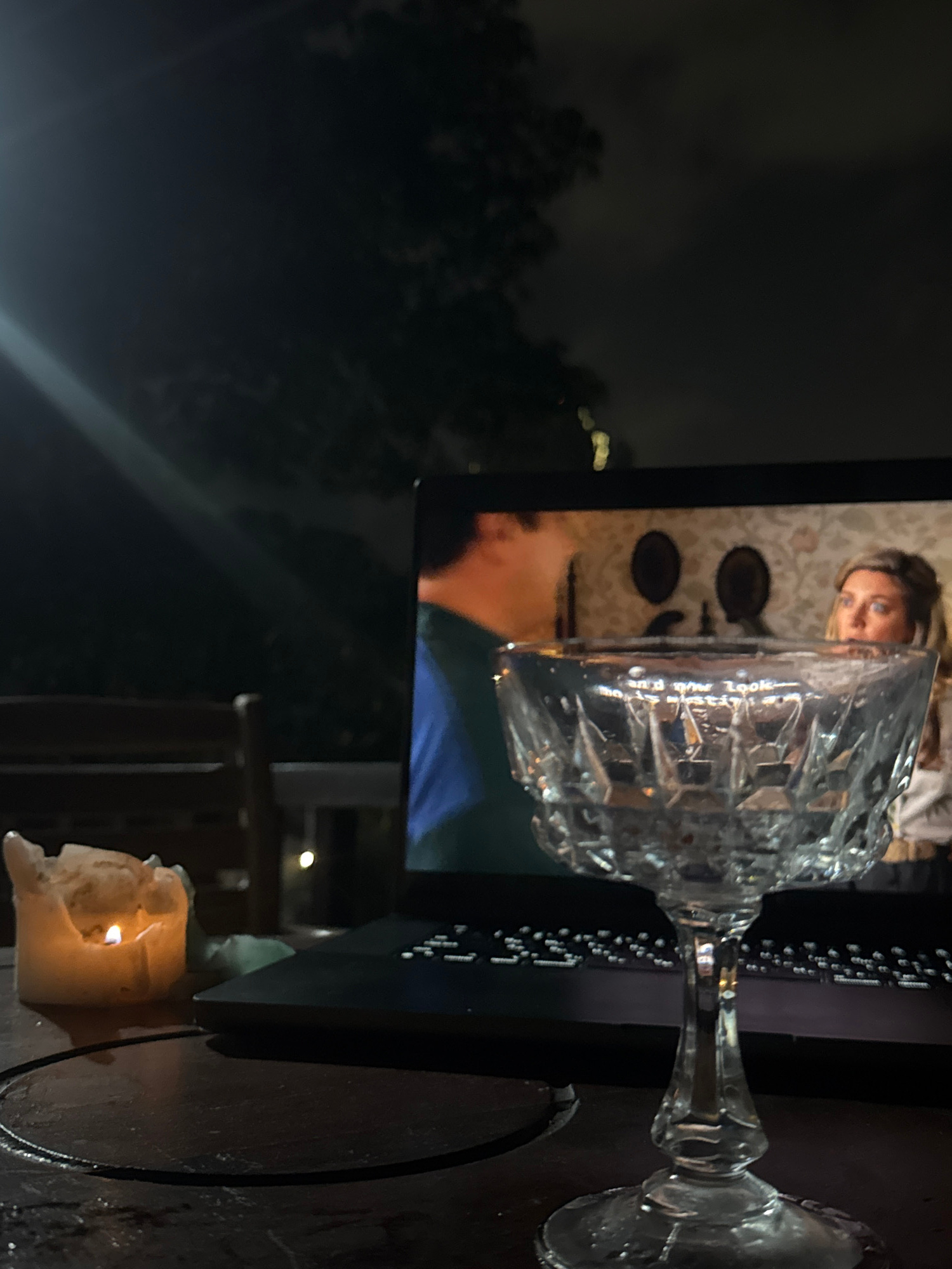 The image shows a dark outdoor scene at night, likely in a residential or semi-outdoor setting. The focus is on a laptop displaying a video of a woman indoors, with a crystal glass placed on the lapto…read more