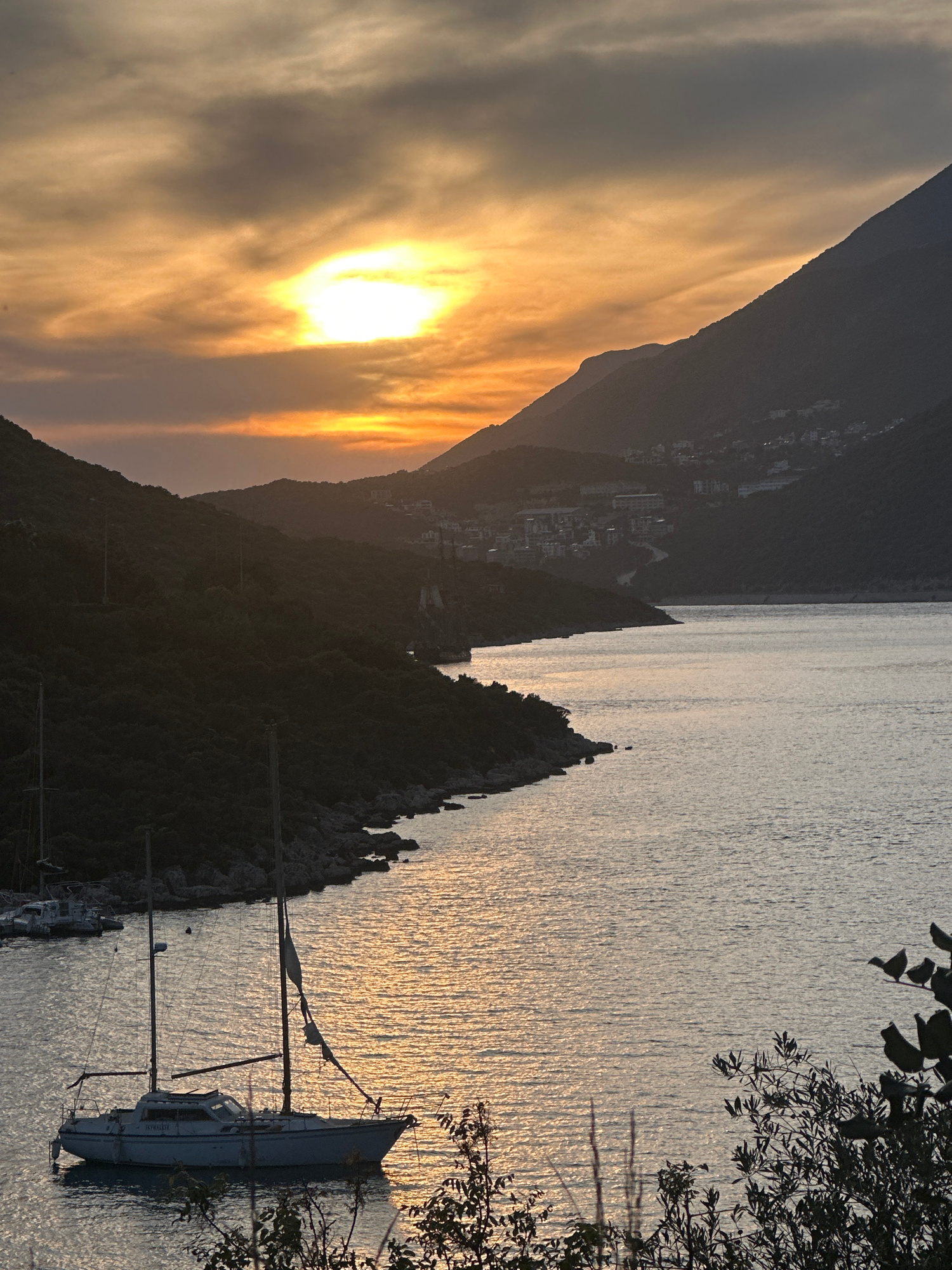 Captured at the harbor near Kaş, Turkey, the image displays a serene sunset over the water. In the foreground, several docked sailboats are visible, their masts reaching towards the sky. The water shi…read more