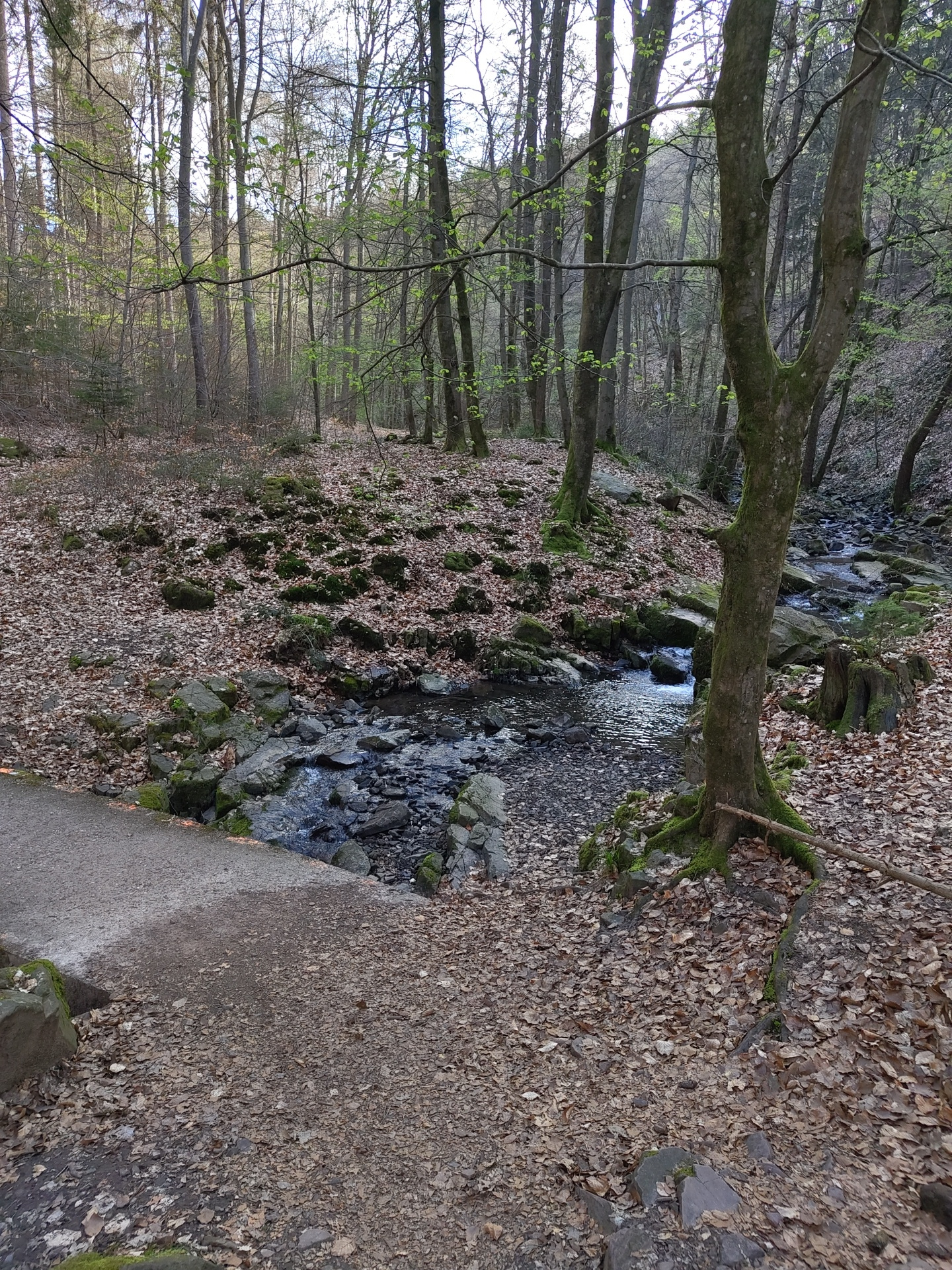The image captures a forest scene in Mettlach, Germany. A small stream runs through the center of the frame, lined with rocks and fallen leaves. Moss covers some of the rocks and tree trunks. Bare tre…read more