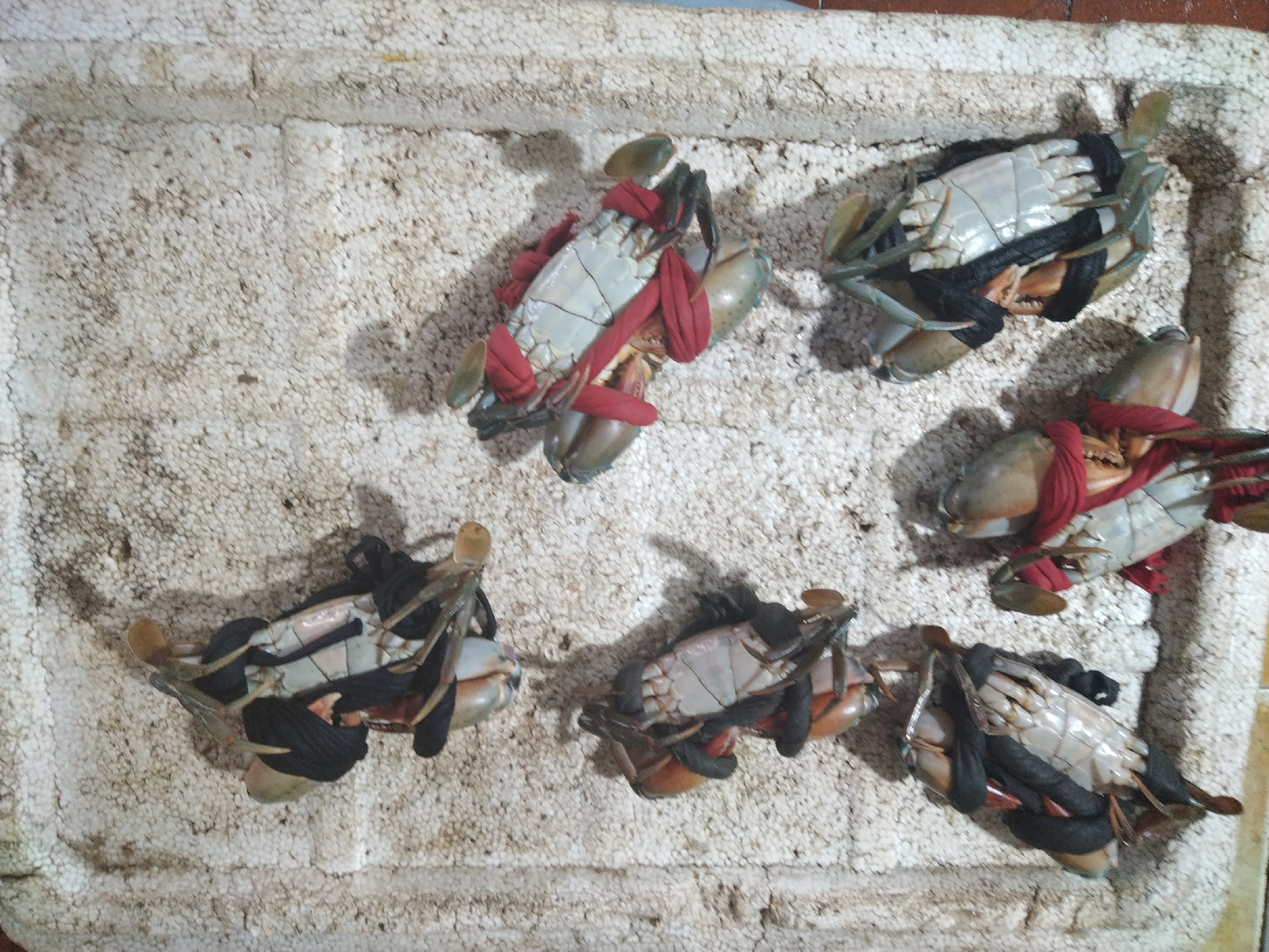 The image shows six crabs with their claws bound with either red or black fabric, arranged on a white styrofoam tray. The background is a white styrofoam with small dark spots. Given the presence of s…read more