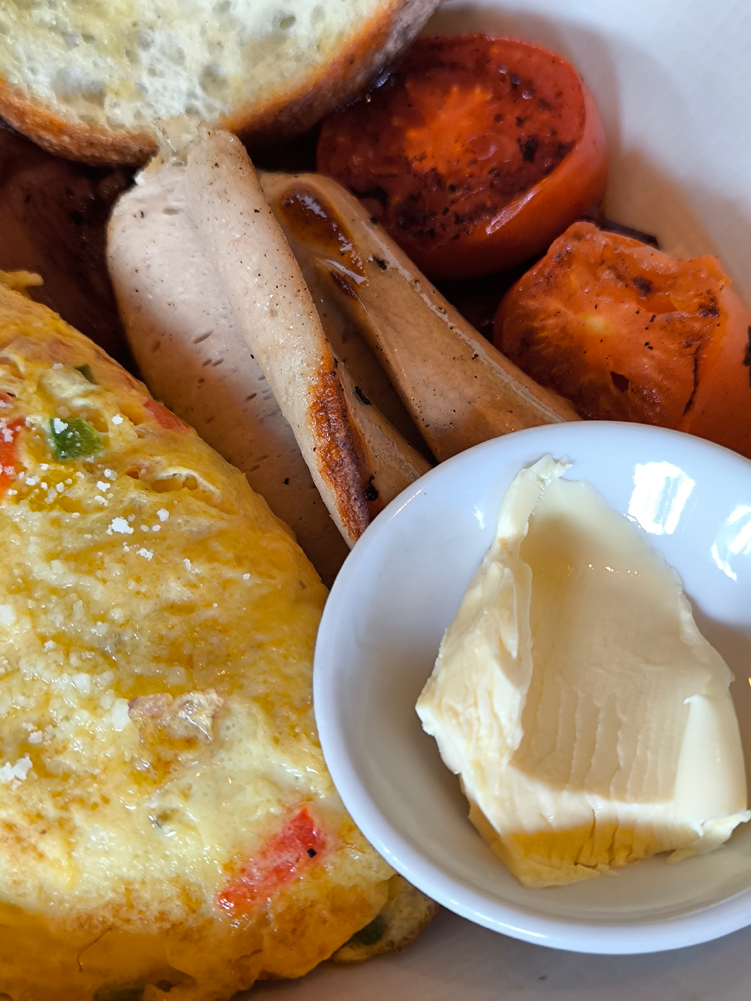 The image is a close-up of a breakfast plate. Components include an omelet with visible bits of red and green vegetables, slices of toasted bread, sausage links (some with grill marks), grilled tomato…read more