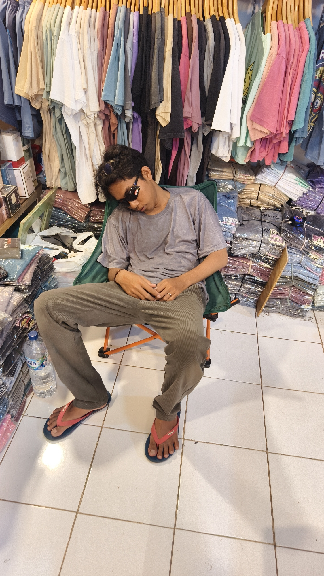 A medium, full shot depicts a man asleep in a chair inside a retail clothing store in Pecatu, Indonesia. The man is wearing sunglasses, a gray t-shirt, and olive-colored pants. He is seated in a green…read more