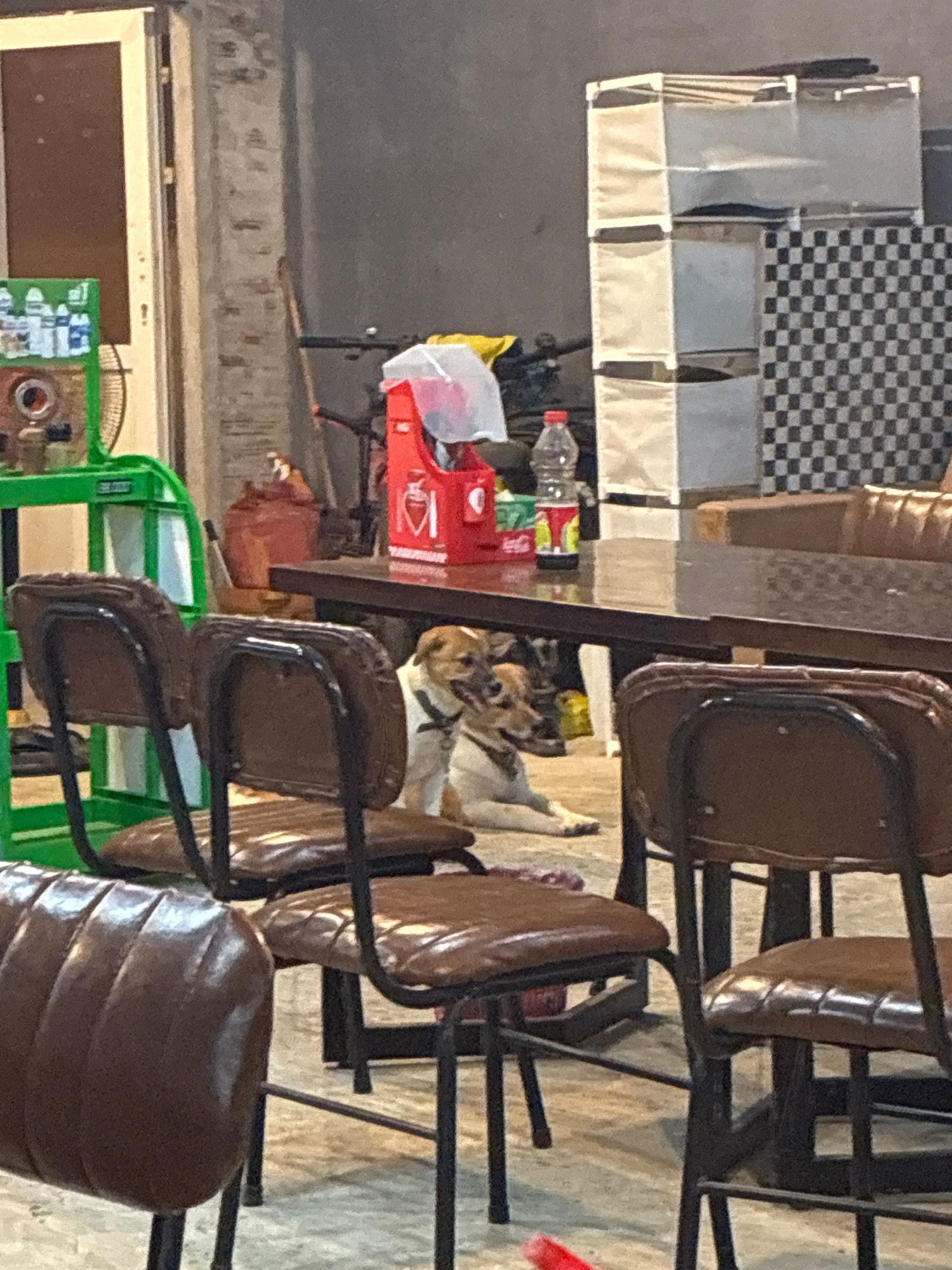 The image shows an indoor scene, possibly a storage area or cluttered room. In the foreground, several brown leather-seated chairs with black metal frames are stacked together. Behind the chairs and e…read more