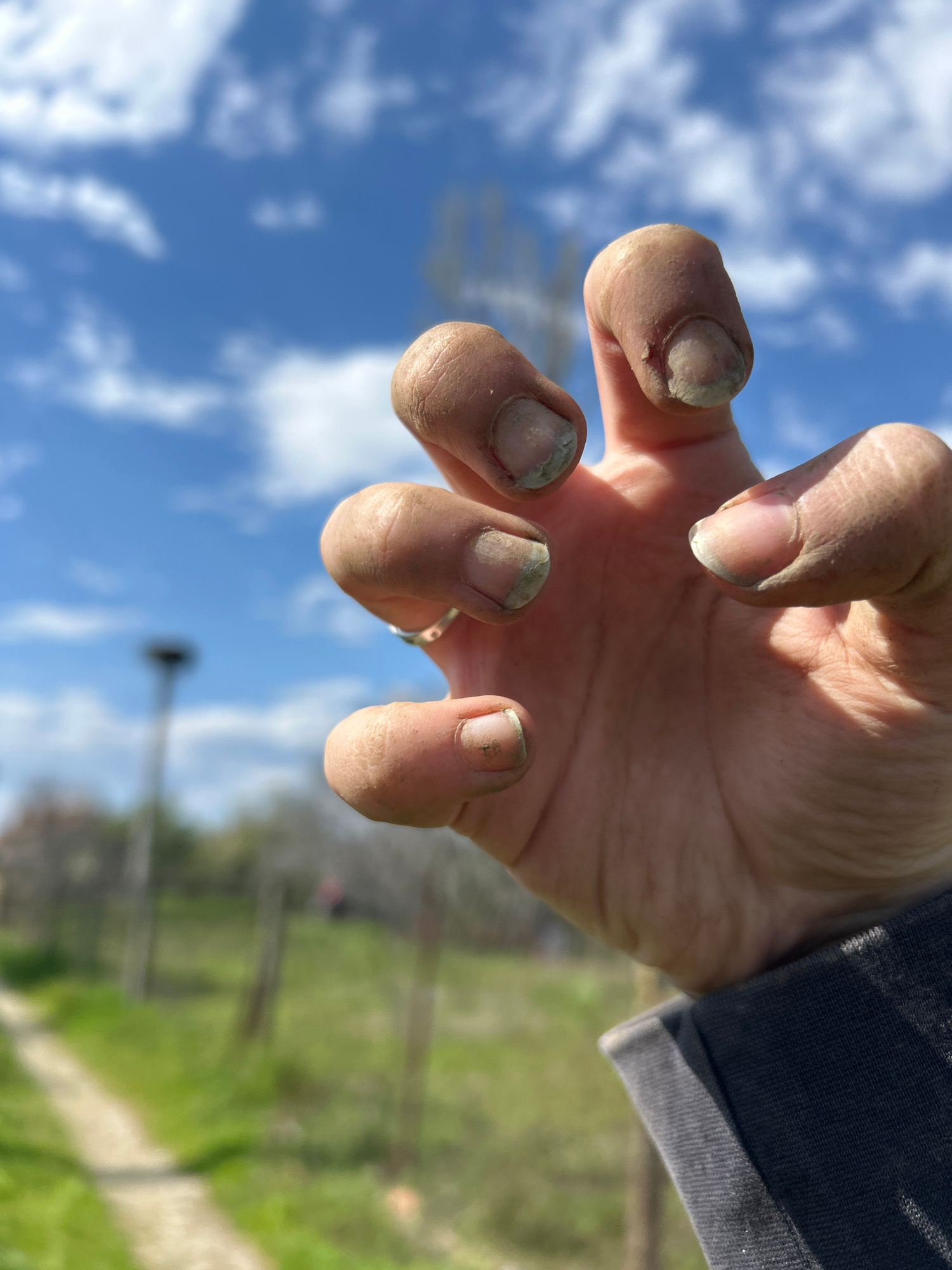 The image shows a close-up view of a dirt-covered hand against a blurred background. The hand is open, with fingers slightly curved and dirty fingernails. A ring is visible on one finger. The backgrou…read more