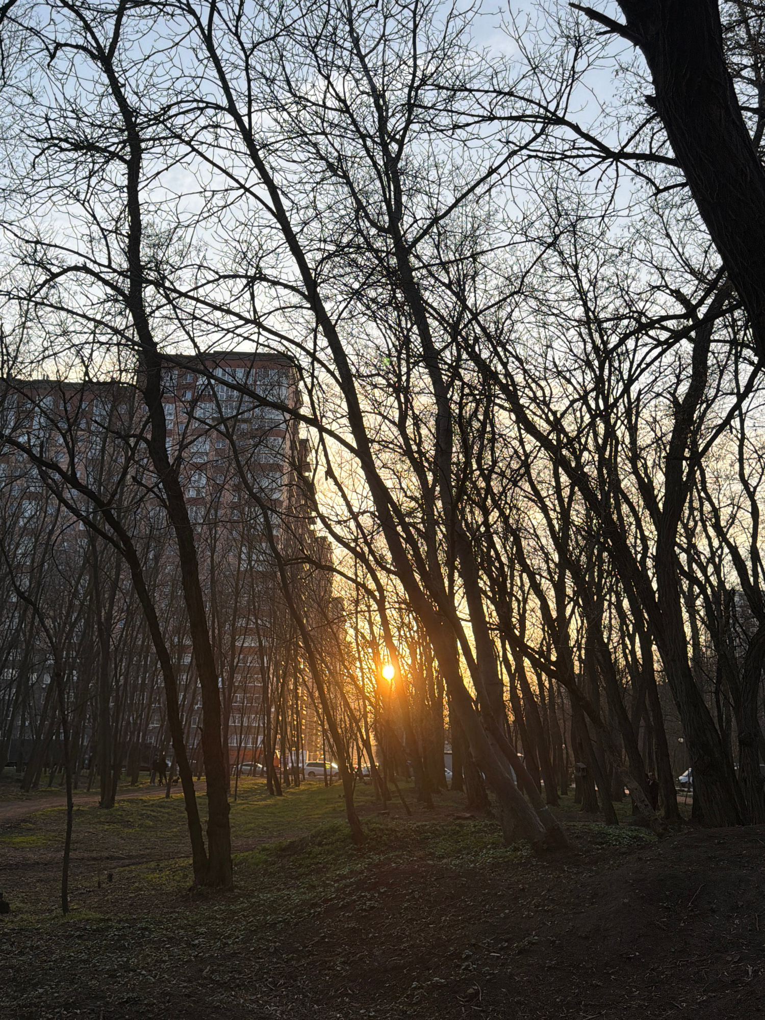 The image depicts a park or forested area in Rostov-on-Don, Russia, during what appears to be late afternoon or early evening, characterized by a low sun near the horizon. The scene is dominated by nu…read more