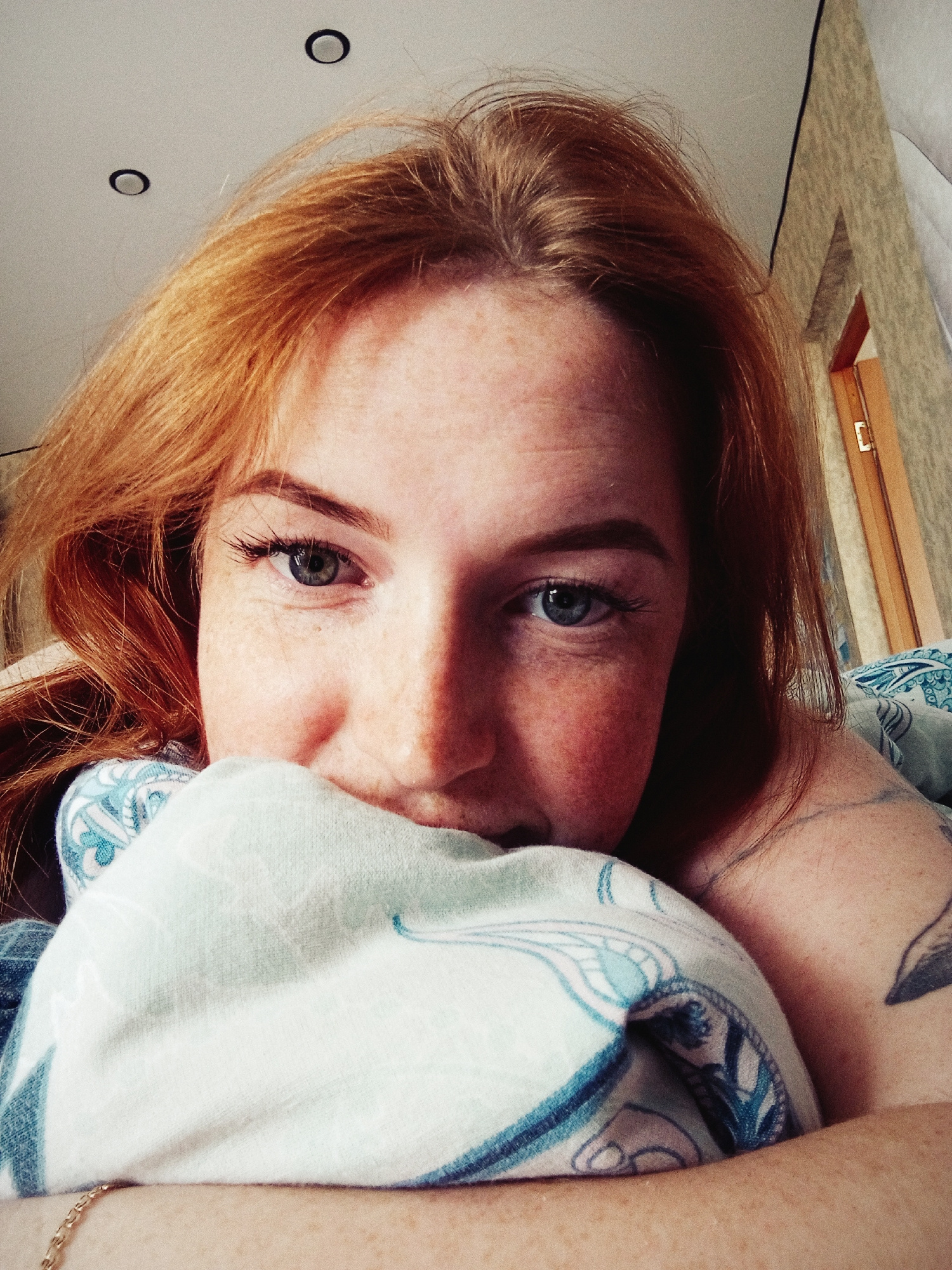 A close-up, slightly tilted, indoor photograph depicts a woman with red hair and fair skin. She has freckles and appears to be partially covered by a light-blue patterned fabric. A gold chain is visib…read more