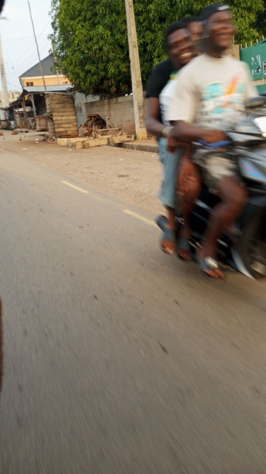 Three Black men are riding on a moving black scooter down a paved road in Zango-ndaji, Nigeria. The driver wears a black baseball cap, a white t-shirt, and patterned shorts. The other two men, whose f…read more