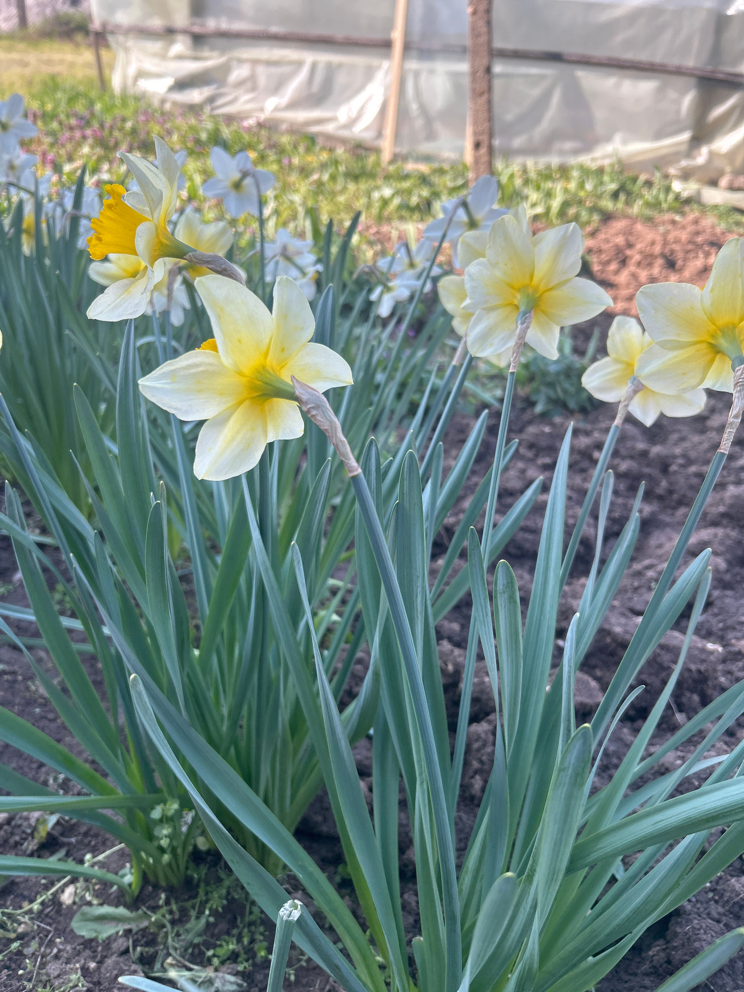 The image shows a row of yellow and white daffodils blooming in dark soil. Long, green leaves sprout from the ground around the flowers. In the background is a blurry structure that may be a greenhous…read more