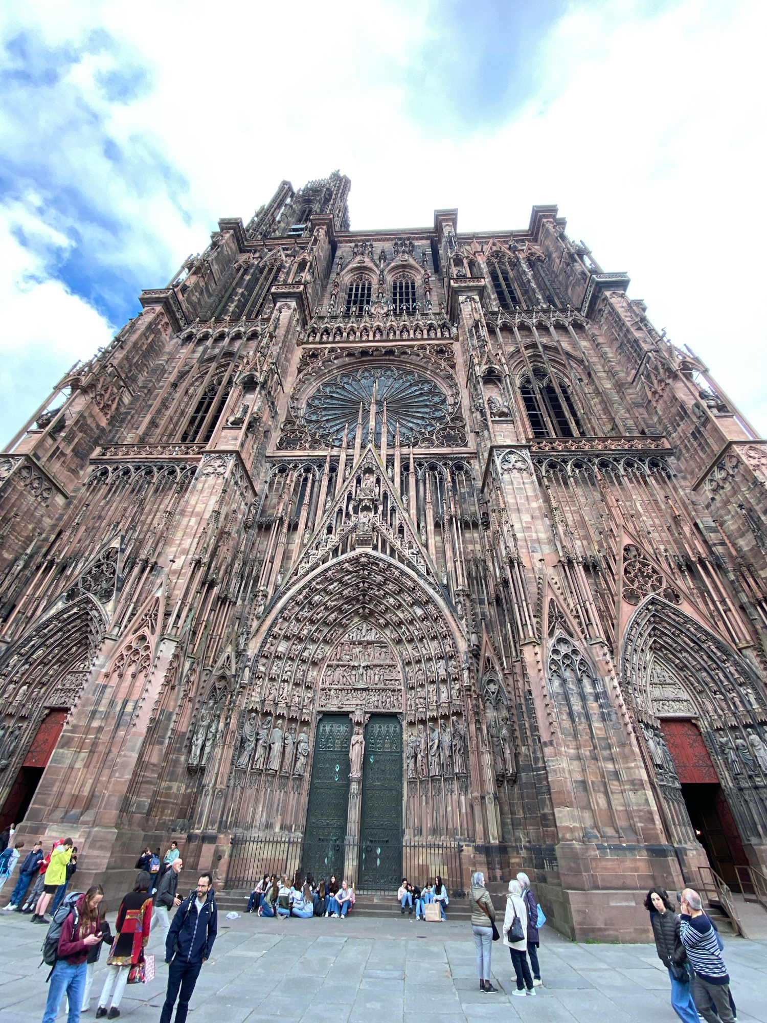 The image depicts the Strasbourg Cathedral in Strasbourg, France. The cathedral's facade is visible, exhibiting its intricate Gothic architecture. A group of people, appearing to be tourists, is prese…read more