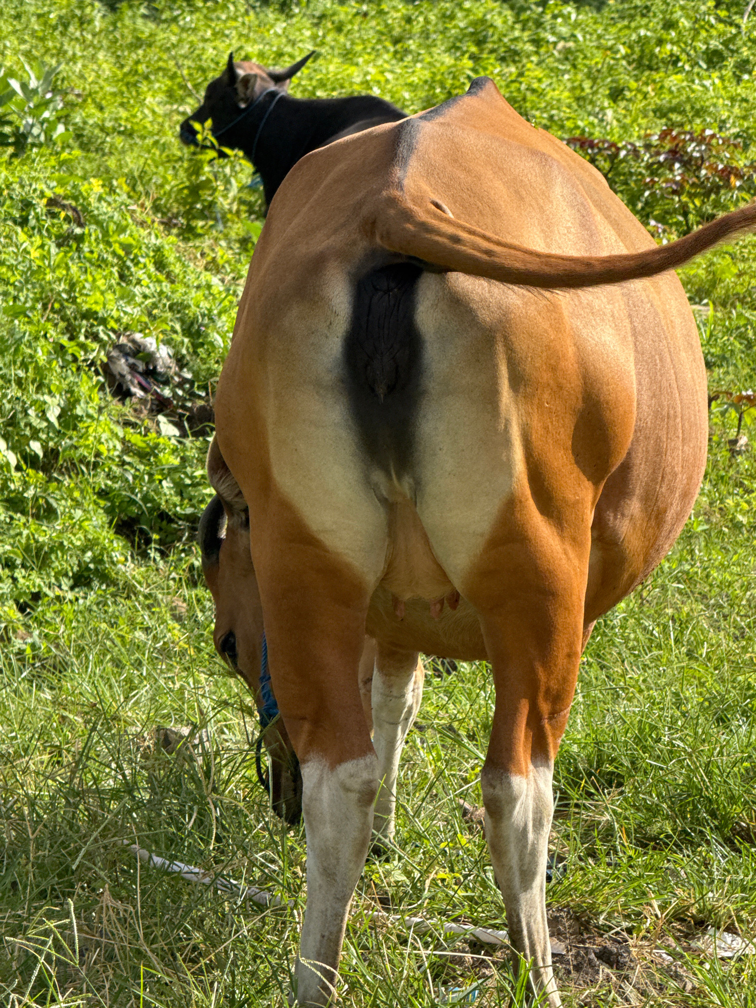 A brown and black cow with a blue rope halter lies on a grassy field. The cow's tail extends upwards. The location is Kuta, Indonesia.