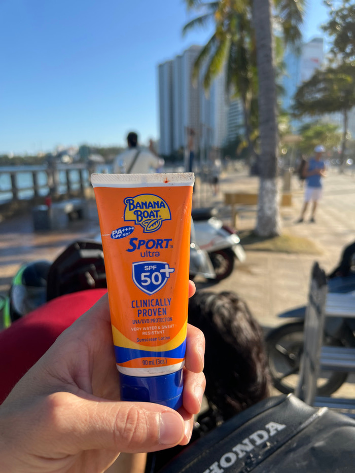 A light-skinned hand holds an orange, blue, and yellow tube of Banana Boat Sport Ultra sunscreen, SPF 50+, PA++++, 90 ml (3 oz), in the foreground. The tube's label prominently displays text including…read more