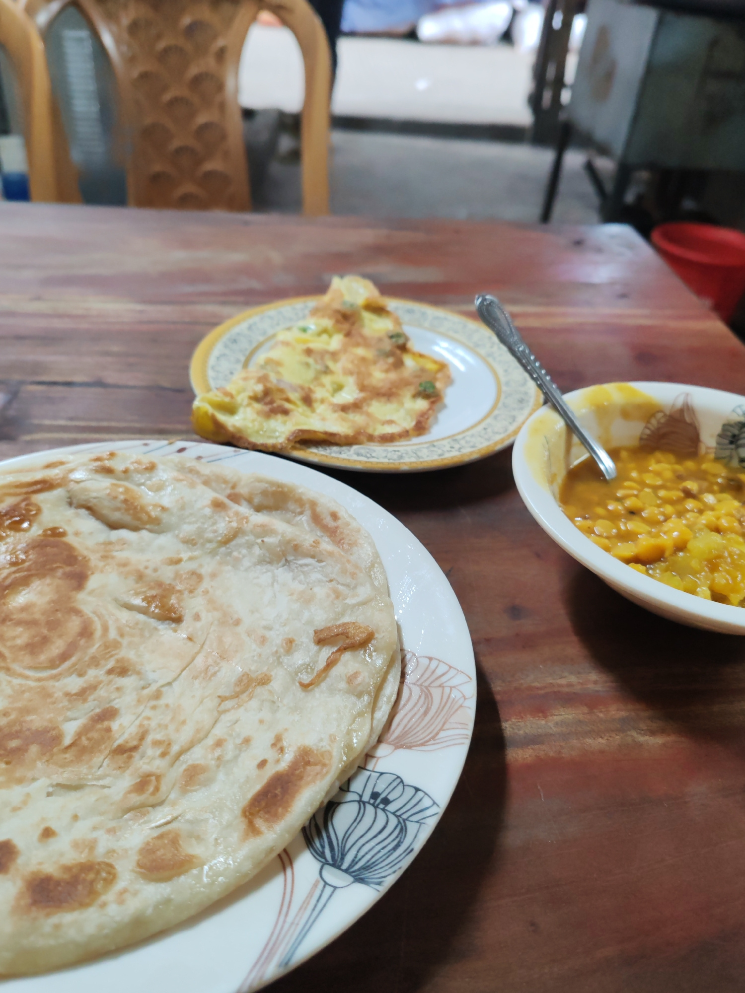 A street food scene in Dhaka, Bangladesh: A wooden table is set with a plate of paratha, an omelet, and a bowl of dal, likely chana dal. A spoon rests in the dal. The table is worn. In the background…read more