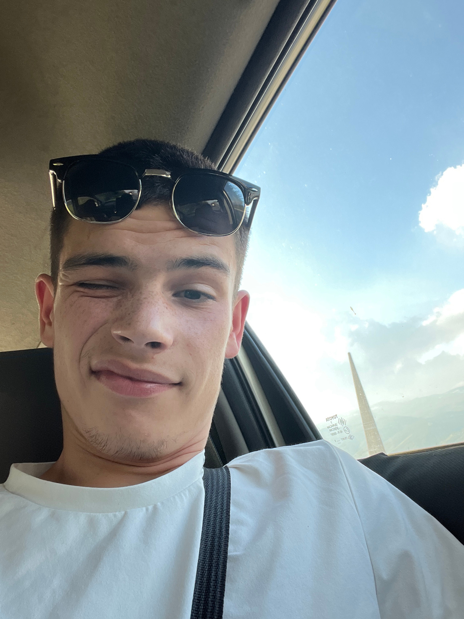 A young man is taking a selfie in a car, looking up towards the open sunroof. He is wearing sunglasses pushed up on his forehead and a white t-shirt, with a seatbelt visible across his chest. The sky…read more