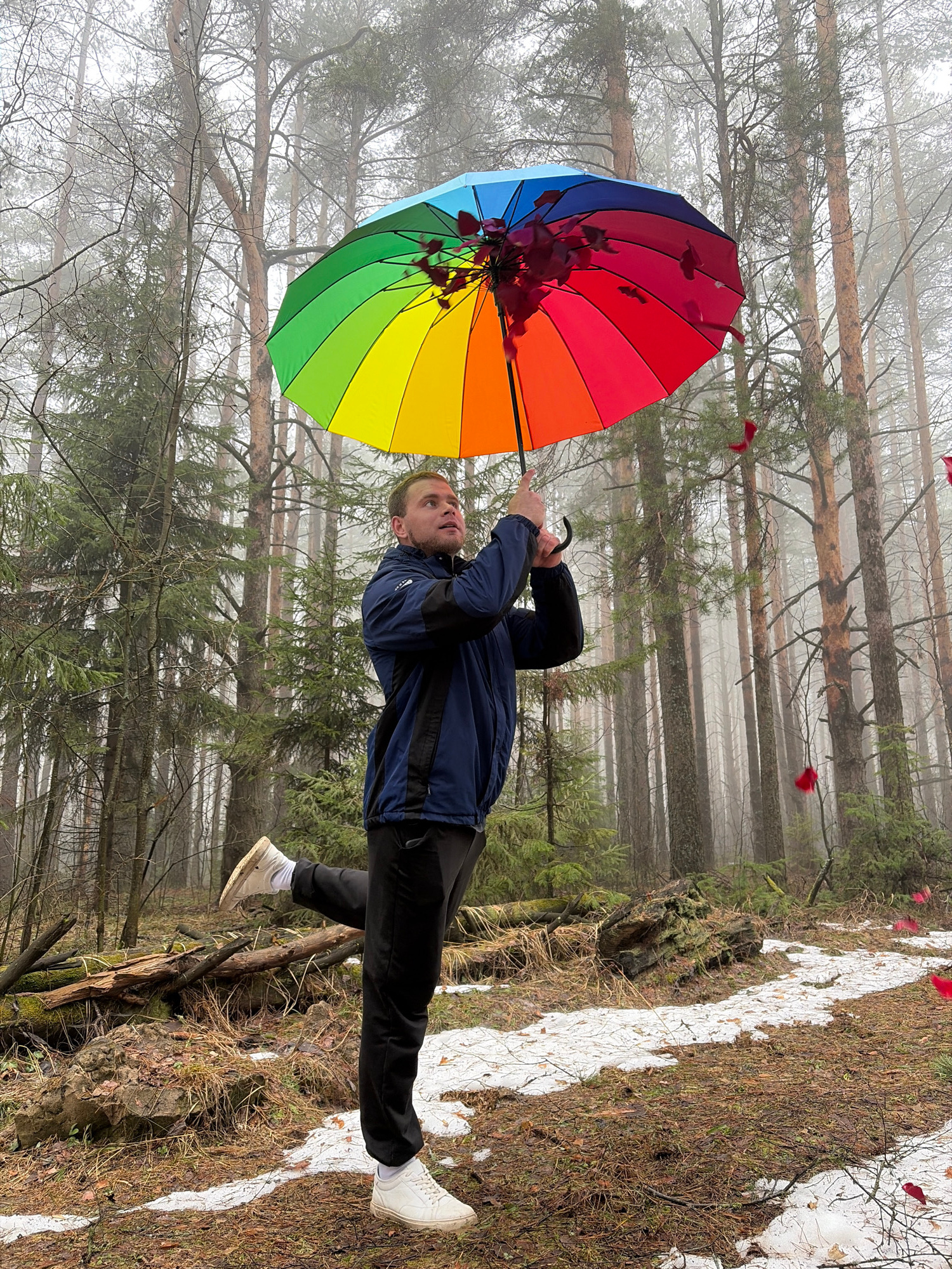 A man stands in a forested area near Прикамский, Russia, holding a rainbow-colored umbrella. The forest is misty, with bare trees and patches of snow on the ground. The man wears a blue jacket, black…read more