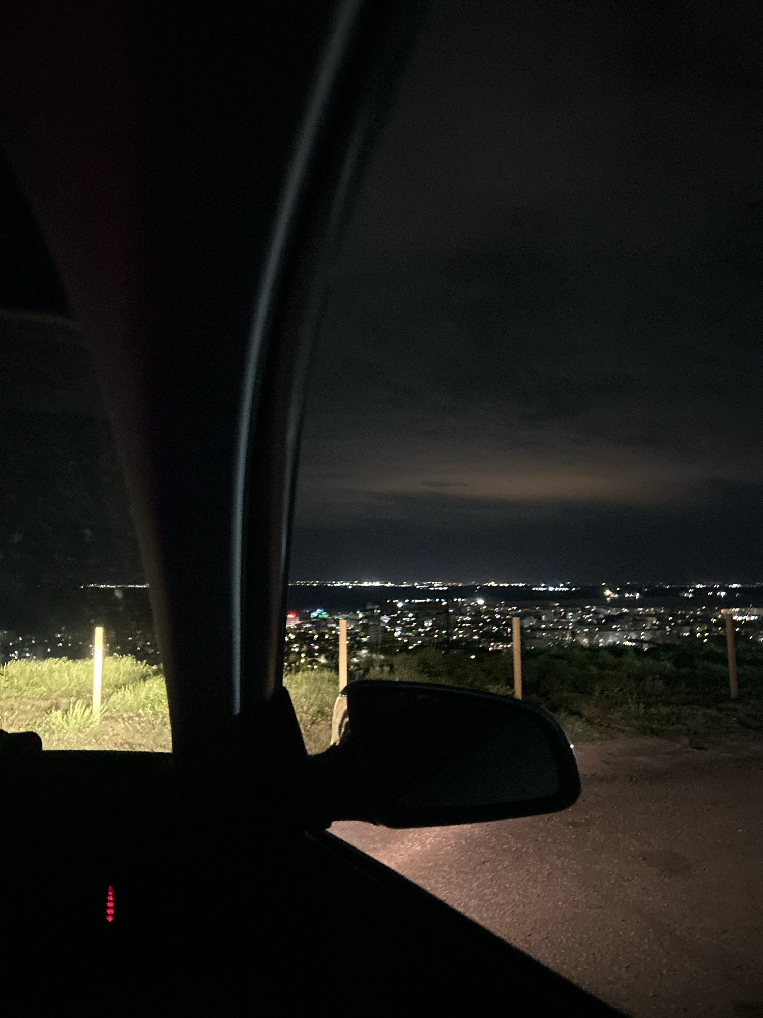 A nighttime view from inside a car. The car is parked next to a road, with a dark, cloudy sky above. In the distance, the lights of a city are visible. The car's side mirror is visible in silhouette.…read more
