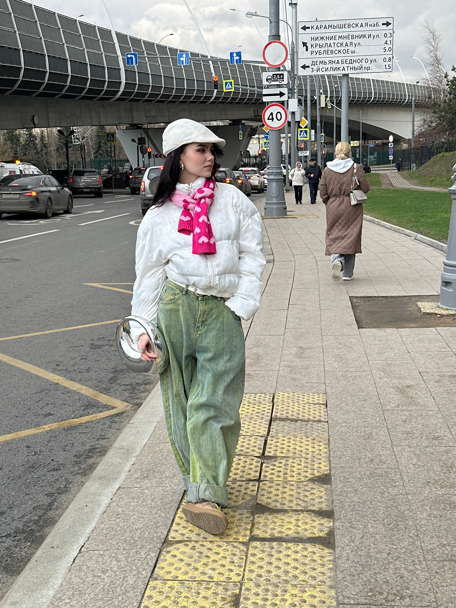 The photo shows a young woman in Moscow, Russia, standing on a sidewalk near a road. She is wearing a white jacket, green jeans, a white beret, and a pink scarf with hearts. She is holding a silver, r…read more
