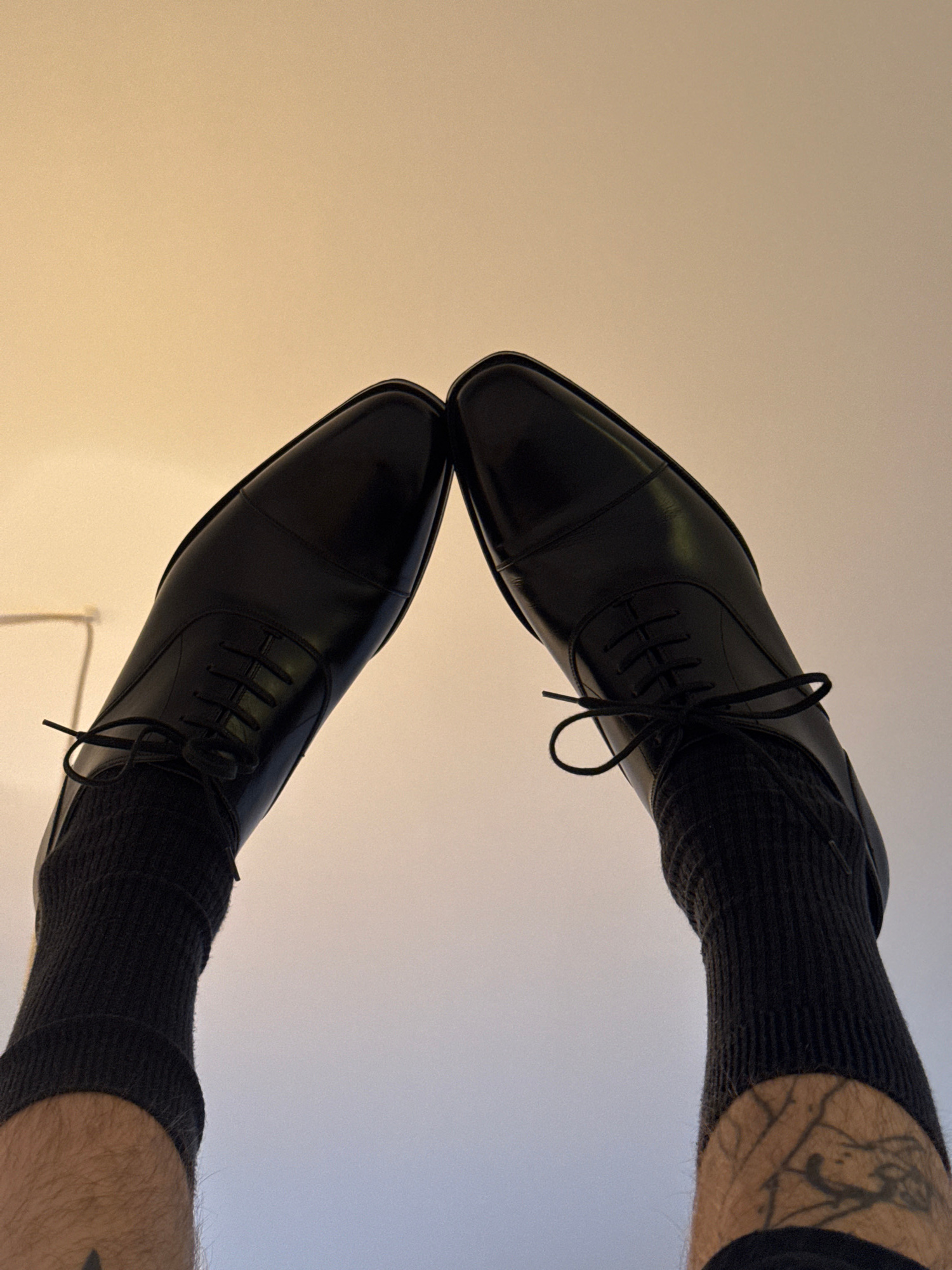 A high-angle shot captures a person's two feet wearing black, polished leather cap-toe Oxford shoes and black ribbed socks, set against a soft, gradient background. The feet are positioned horizontall…read more