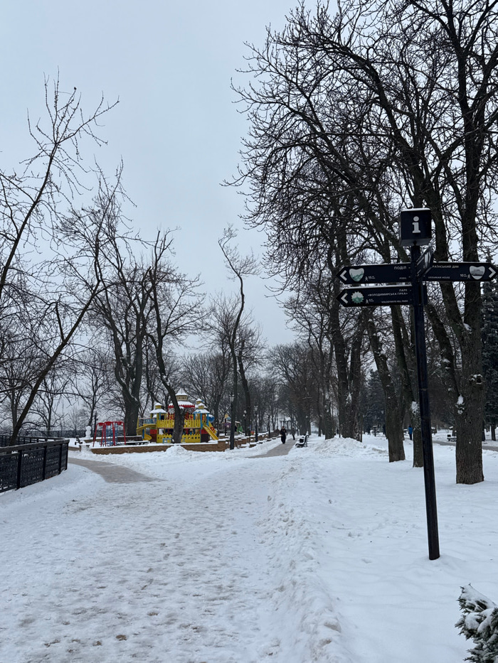 The image depicts a snow-covered park scene on an overcast winter day, identified as Volodymyr Hill Park in Kyiv, Ukraine. The location is confirmed by a black multi-directional signpost in the right…read more
