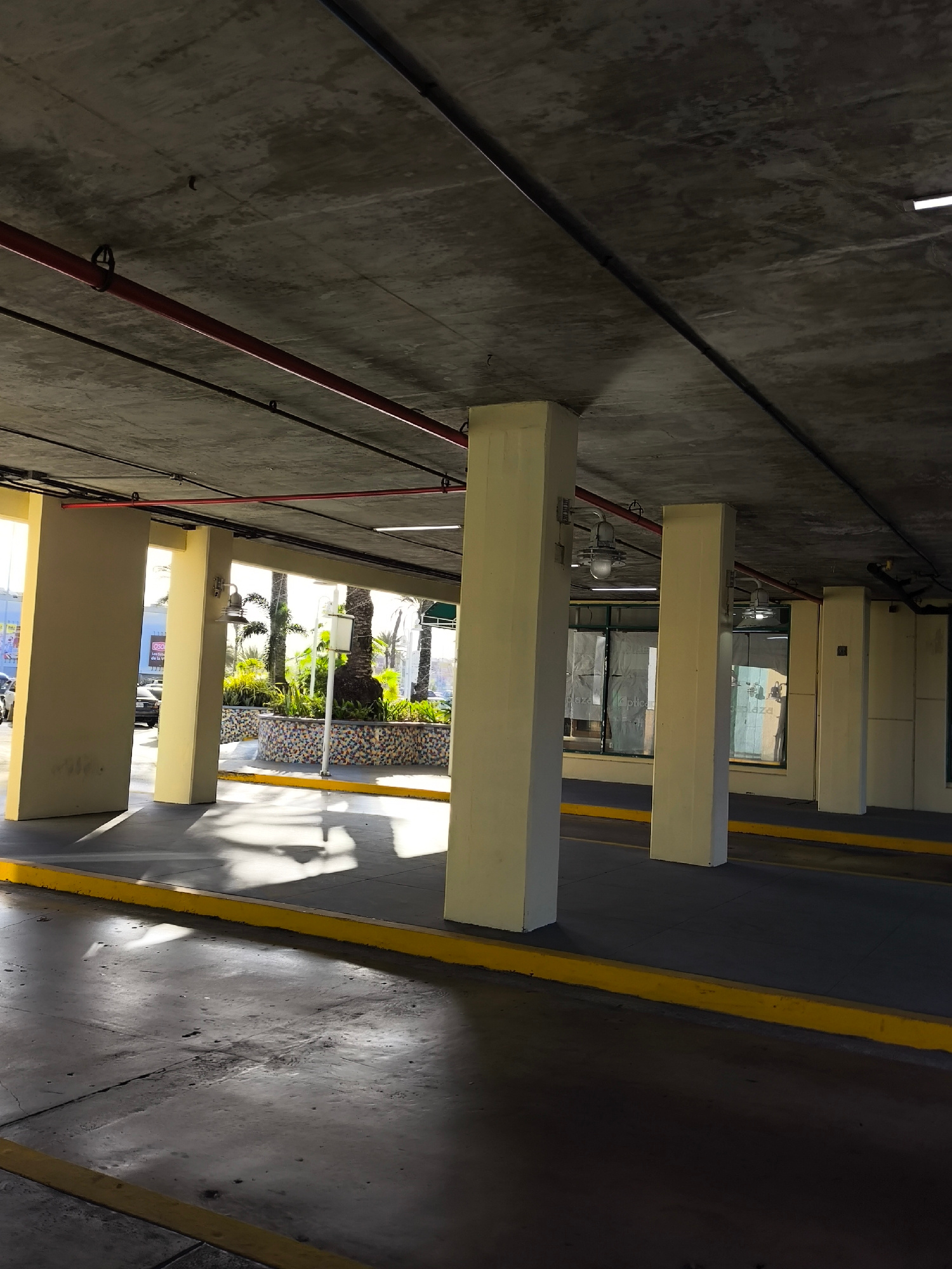 The image depicts the interior of a parking garage in Pampatar, Venezuela. The location appears to be at or near a shopping plaza ("Plaza"). The architecture is dominated by a raw, concrete ceiling wi…read more