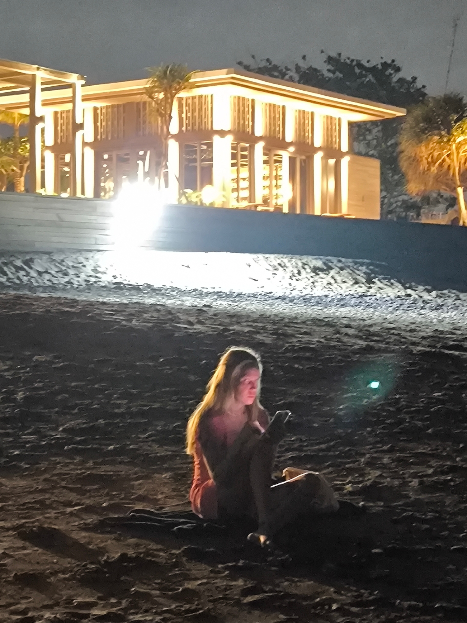 A woman is sitting on a dark beach in Canggu, Indonesia, at night. She is illuminated by the light of her mobile phone, which she is holding in her hands. Behind her is a building with illuminated arc…read more