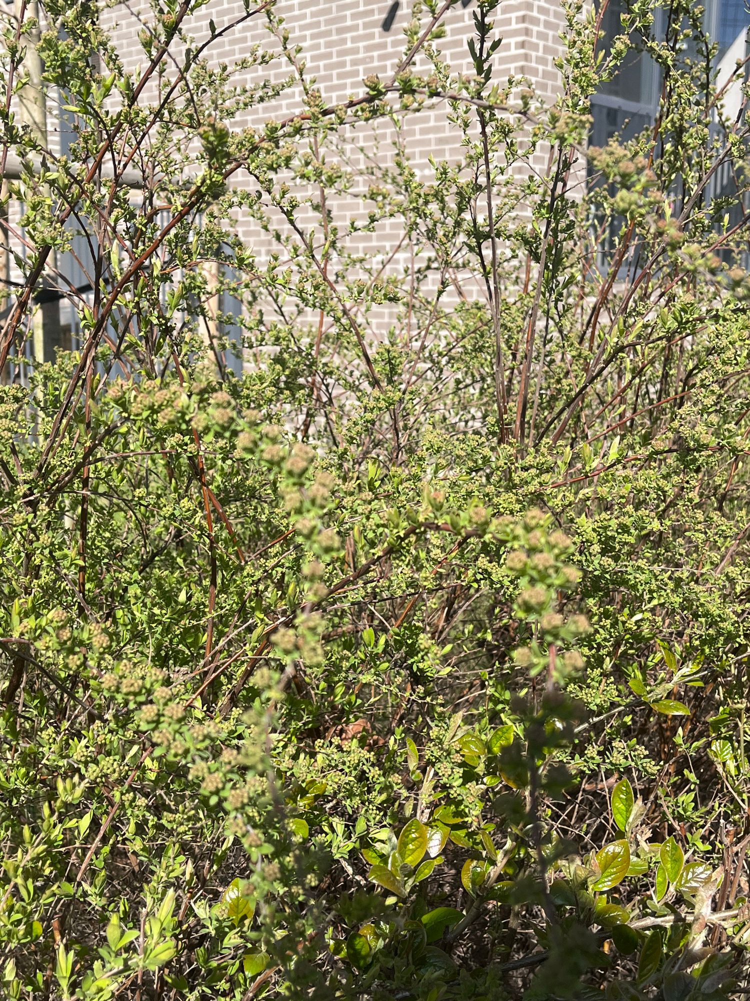 This vertically oriented image captures a dense shrub or bush, richly covered with new growth. The plant occupies the majority of the frame, featuring numerous thin, dark brown branches adorned with s…read more