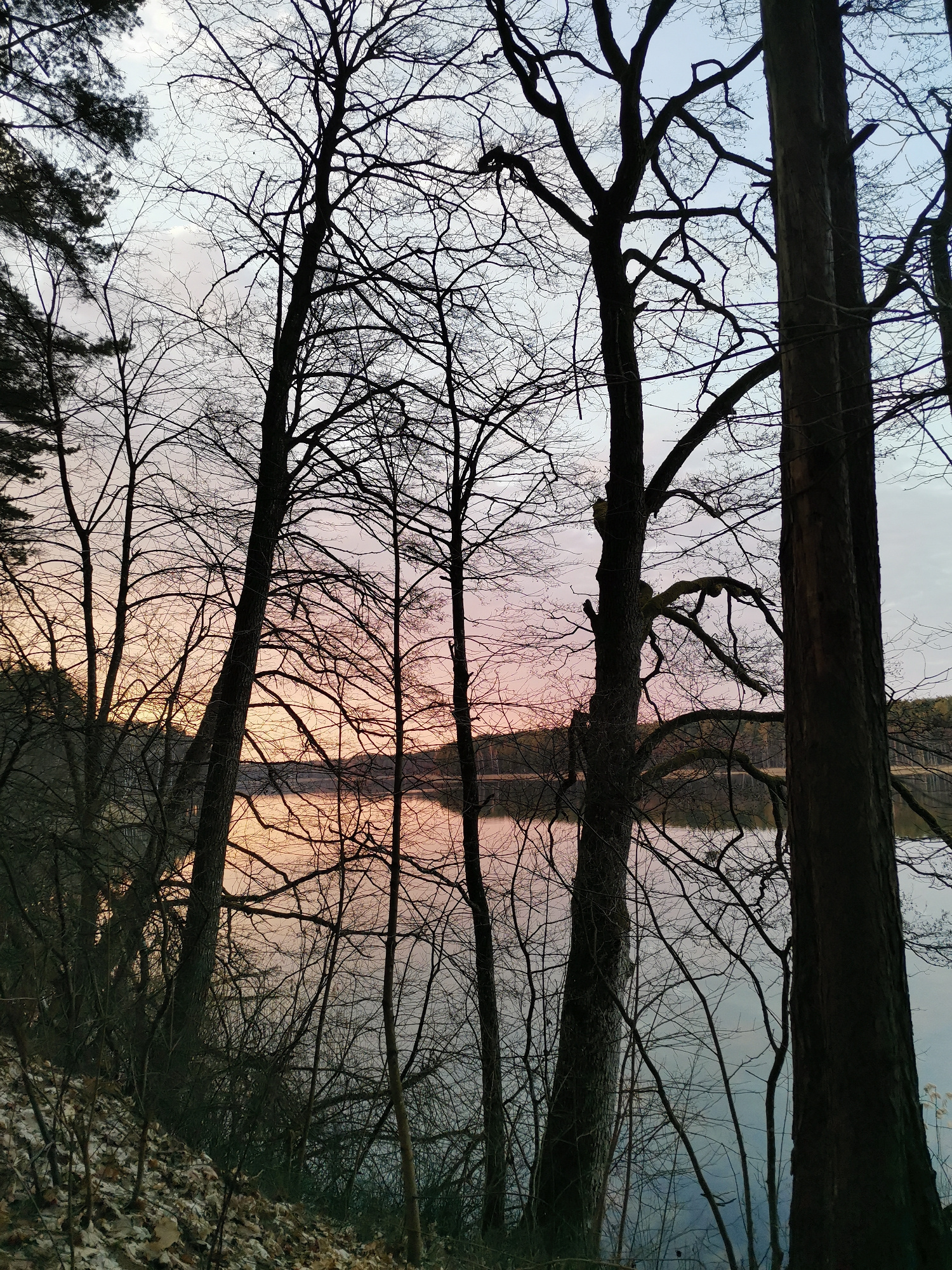 The image depicts a serene, somewhat somber scene captured in Парэчча, Belarus. It is a landscape dominated by bare trees silhouetted against a muted sky at dusk or dawn. The trees are slender and the…read more