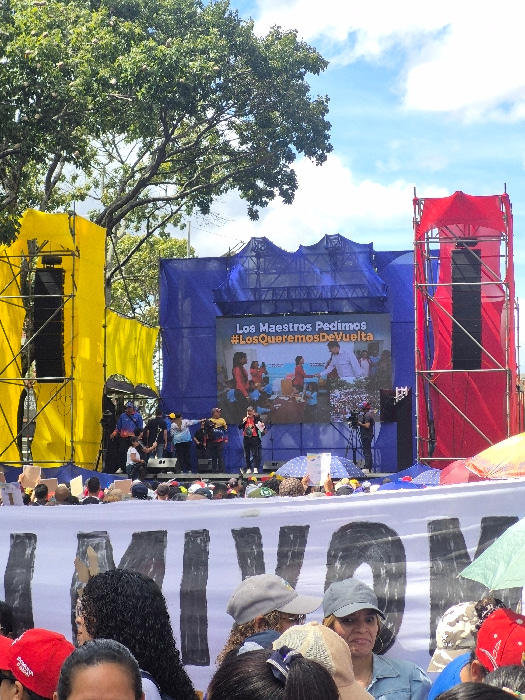An outdoor event with a large crowd is visible. A stage is set up with scaffolding draped in yellow, blue, and red fabric. A digital screen displays people and text. A large white banner with black le…read more