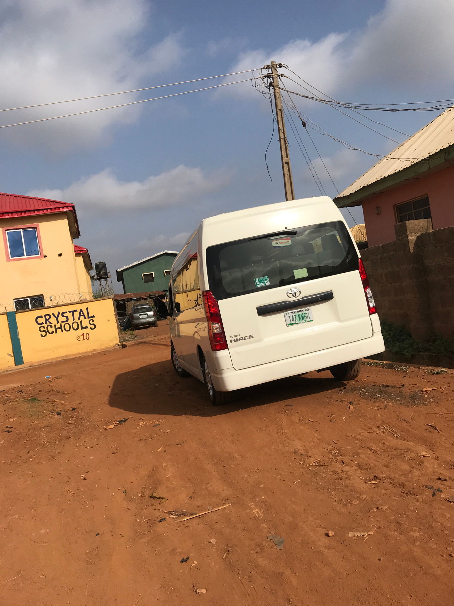 The image captures a street scene in Ilorin, Nigeria, under bright daylight conditions. The primary subject is a white Toyota Hiace van, parked on a reddish-brown dirt road and viewed from its rear.…read more