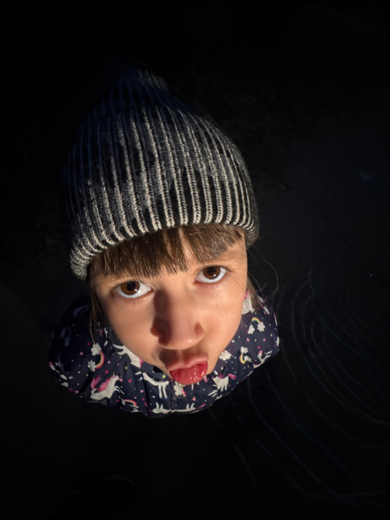 A young child is captured in a close-up, upward-angled shot against a predominantly dark background. The child, with light brown hair peeking from under a striped grey and white beanie, is looking dir…read more