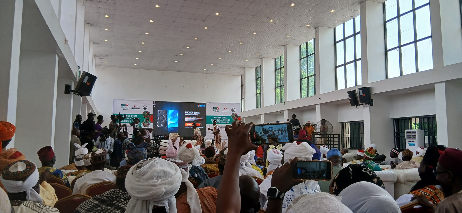 This media file captures an indoor event, likely a forum or conference, held during the daytime as indicated by the bright natural light entering through large, grid-patterned windows lining the upper…read more