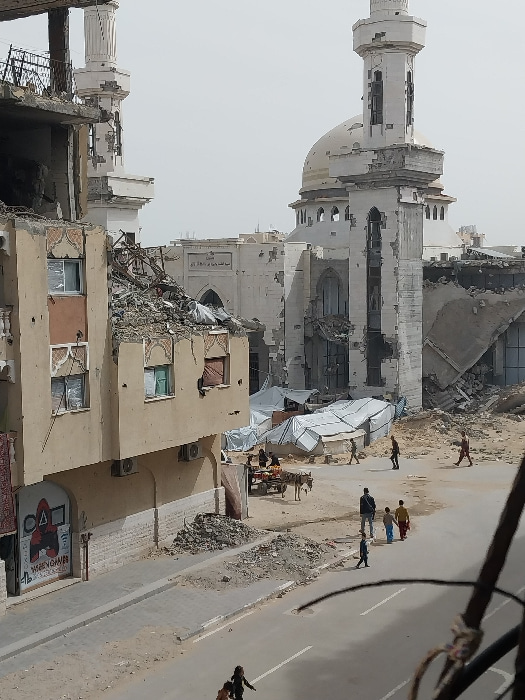 In Khan Yunis, Palestinian Territory, an urban street scene displays extensive structural damage under a hazy sky. A large mosque with a light-colored dome and two minarets is prominent in the backgro…read more