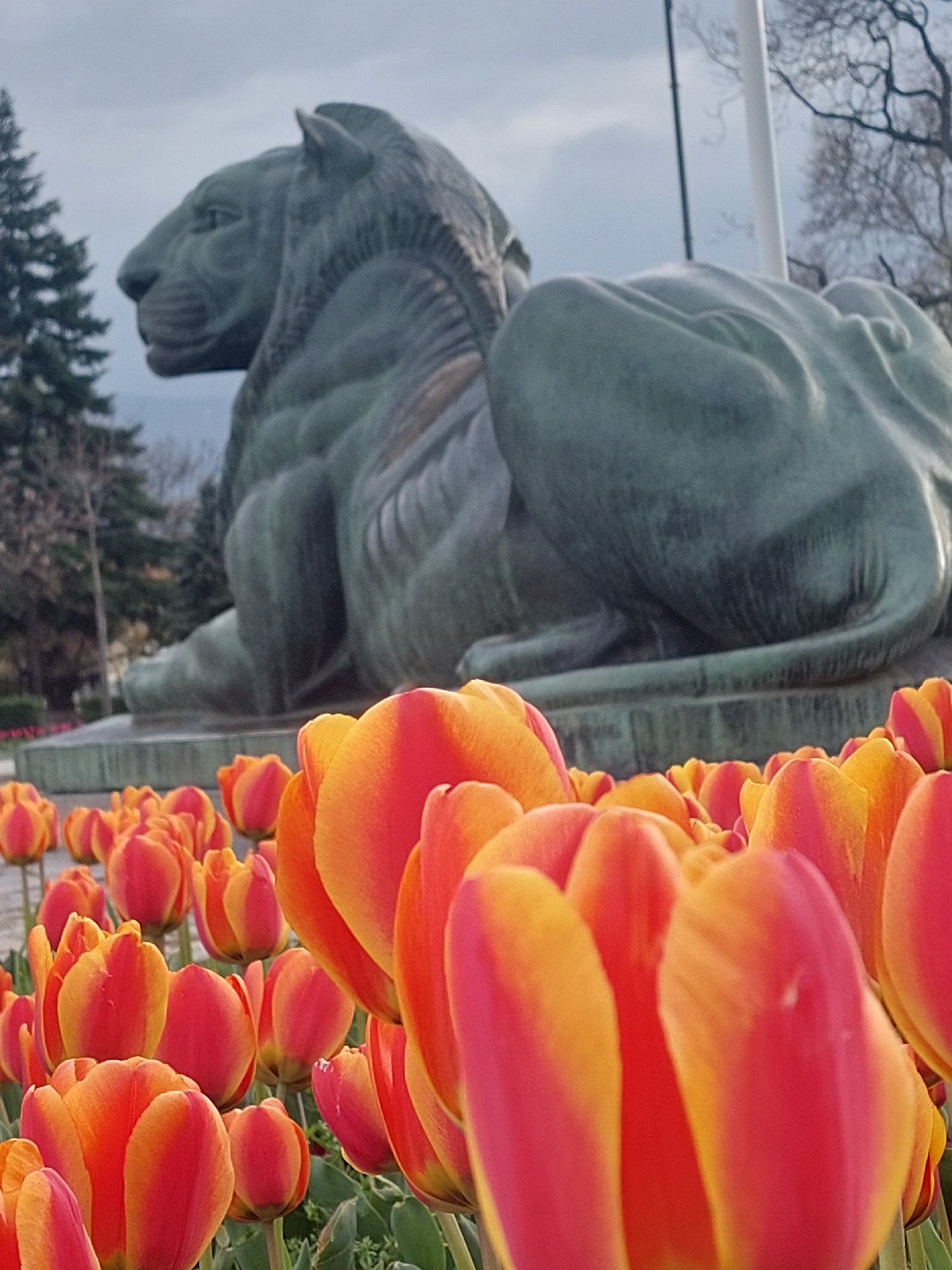 The image displays a rotated outdoor scene, primarily featuring a dense cluster of vibrant tulips on the right and a large, dark statue on the left. The tulips, occupying the right side of the frame,…read more