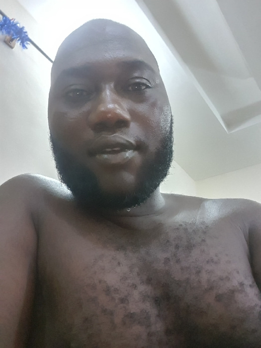 An adult dark-skinned male is depicted in a close-up, upward-angled shot. He has a bald or very closely shaven head and a full dark beard and mustache. He is bare-chested, displaying scattered dark ha…read more