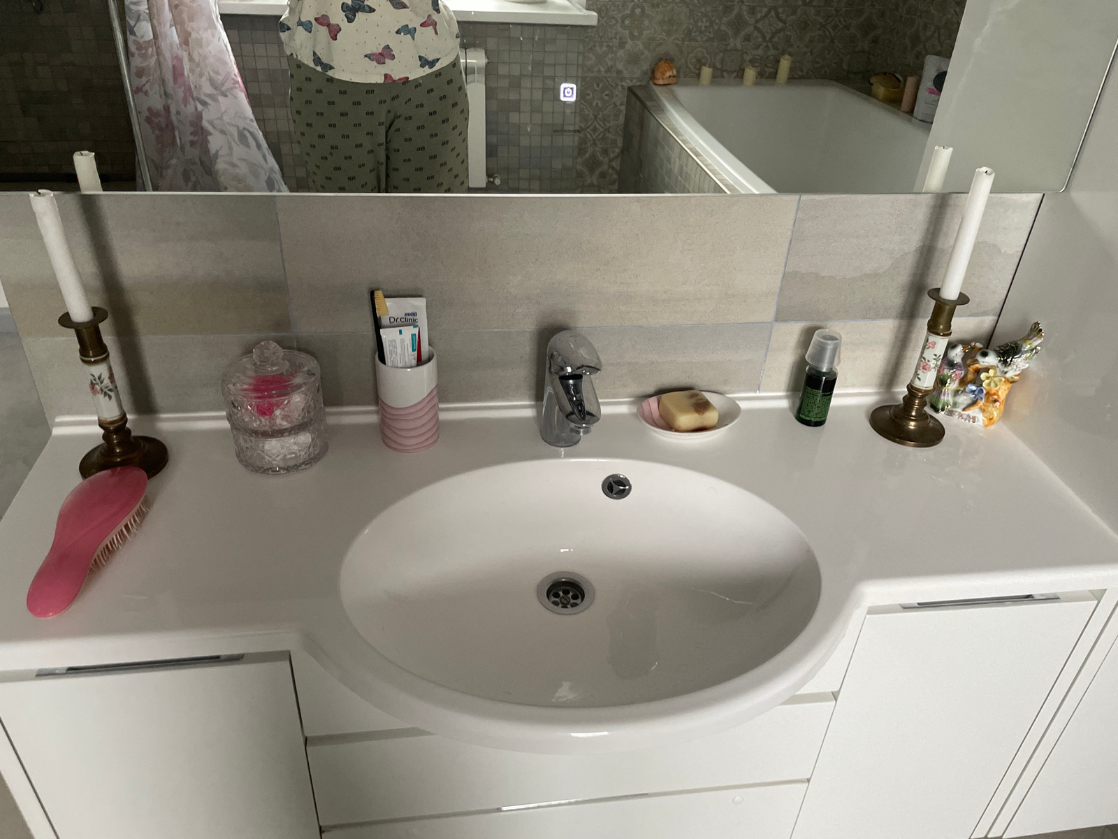 Here is a forensic description of the image: **Scene:** The image appears to be a close-up shot of a bathroom vanity. The vanity is white and features a white, oval-shaped sink. A chrome faucet is mo…read more