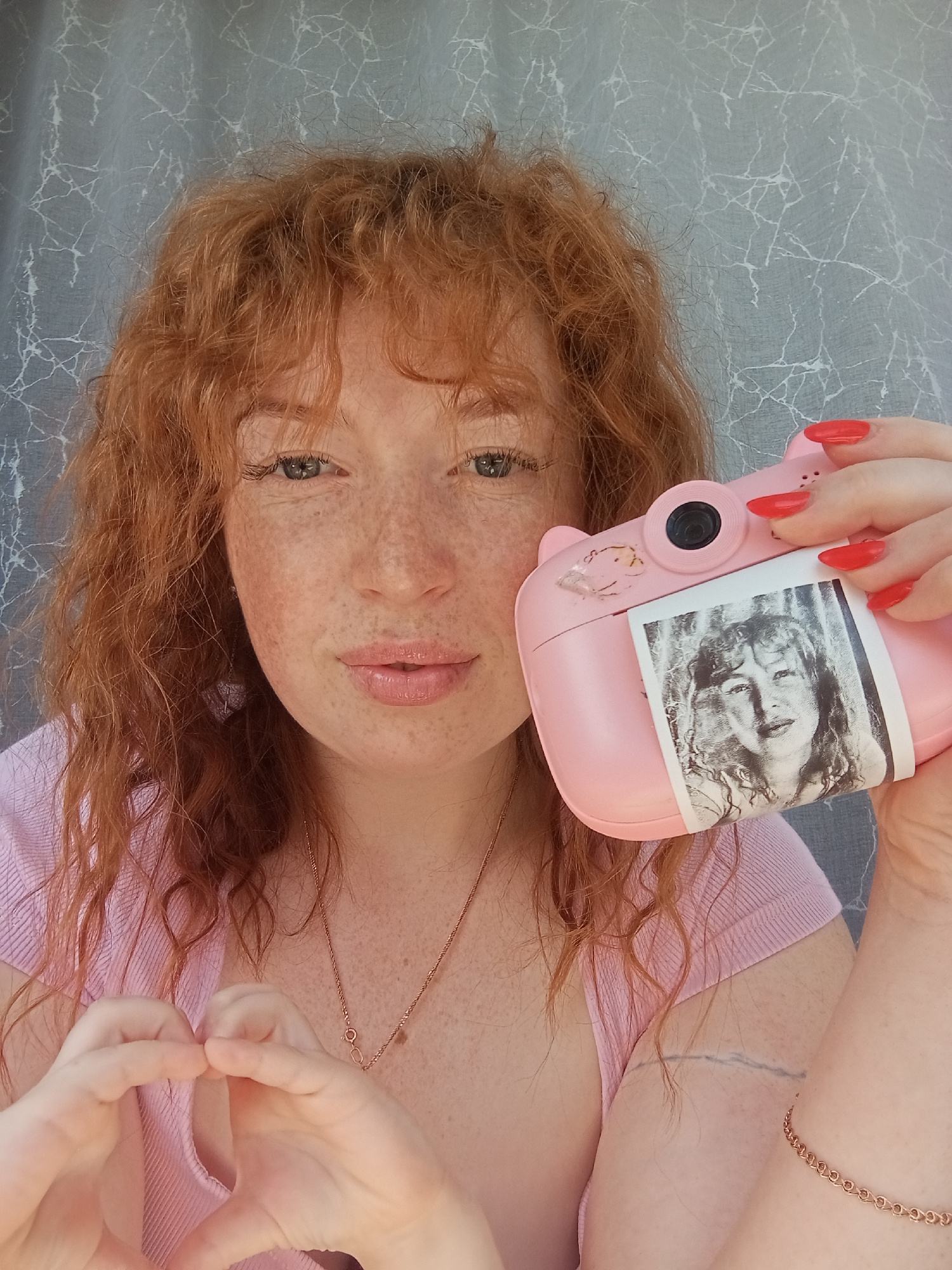 A woman with red hair and freckles, holding a pink camera with a black and white photo attached to it, lies on a grey patterned surface. She makes a heart shape with her fingers. She wears a pink shir…read more