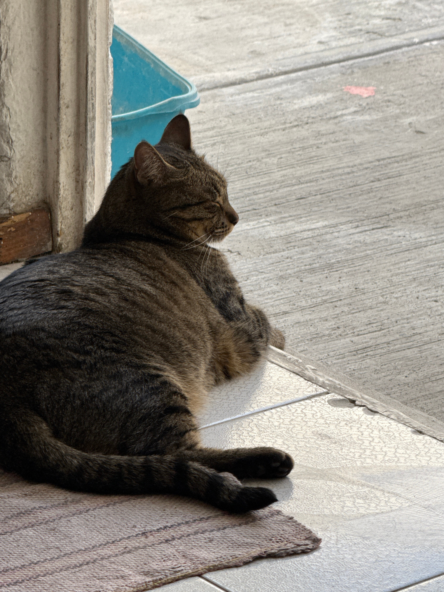 A tabby cat is lying on its side on a light-colored rug placed on white floor tiles. The cat's head is tilted upwards, and its legs are extended. A portion of a blue container is visible near the cat'…read more