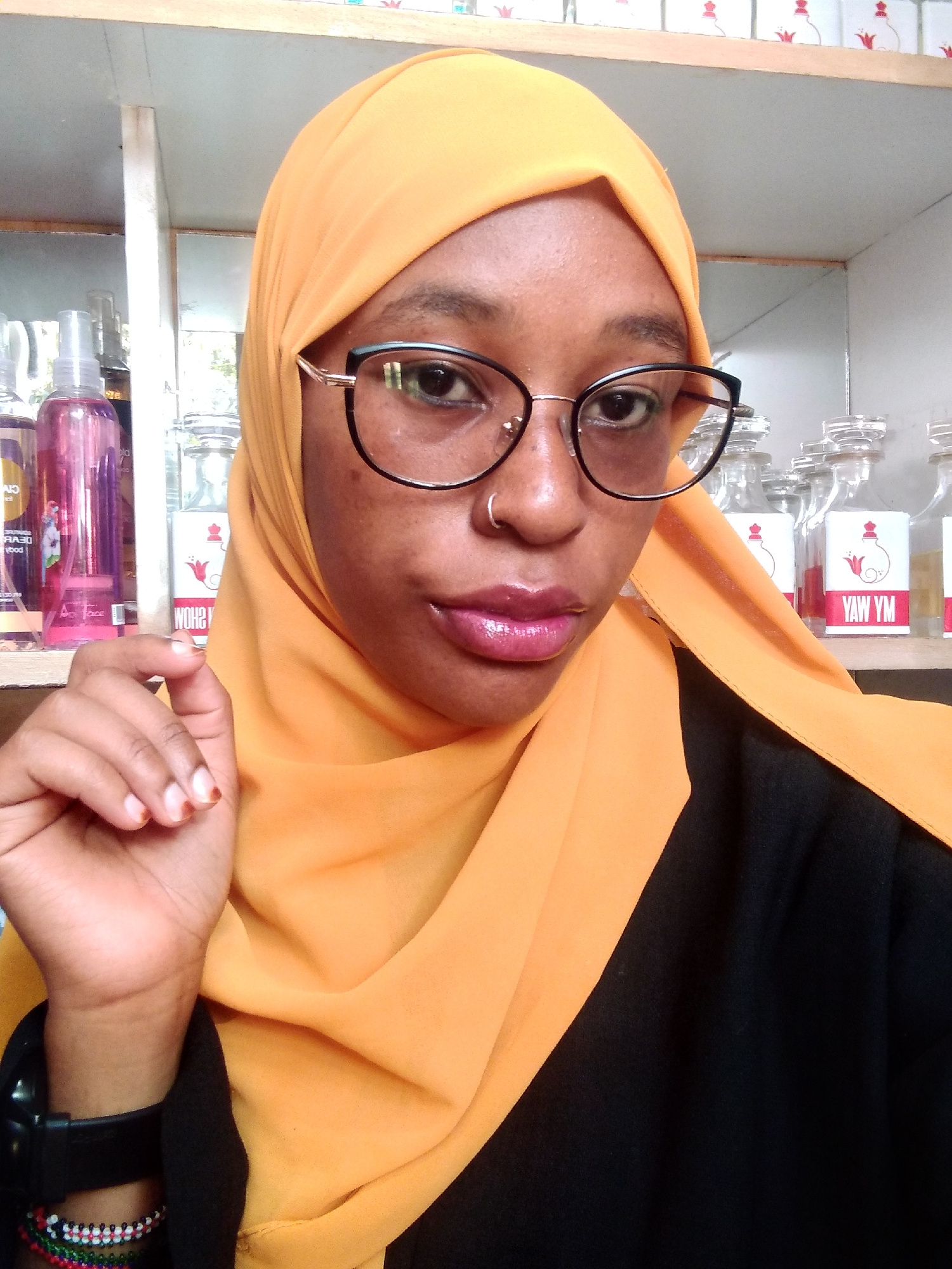 A woman wearing a yellow hijab and glasses is shown from the chest up. She has a nose ring and dark lipstick. She is wearing a black garment beneath the hijab and a bracelet and watch on her left wris…read more